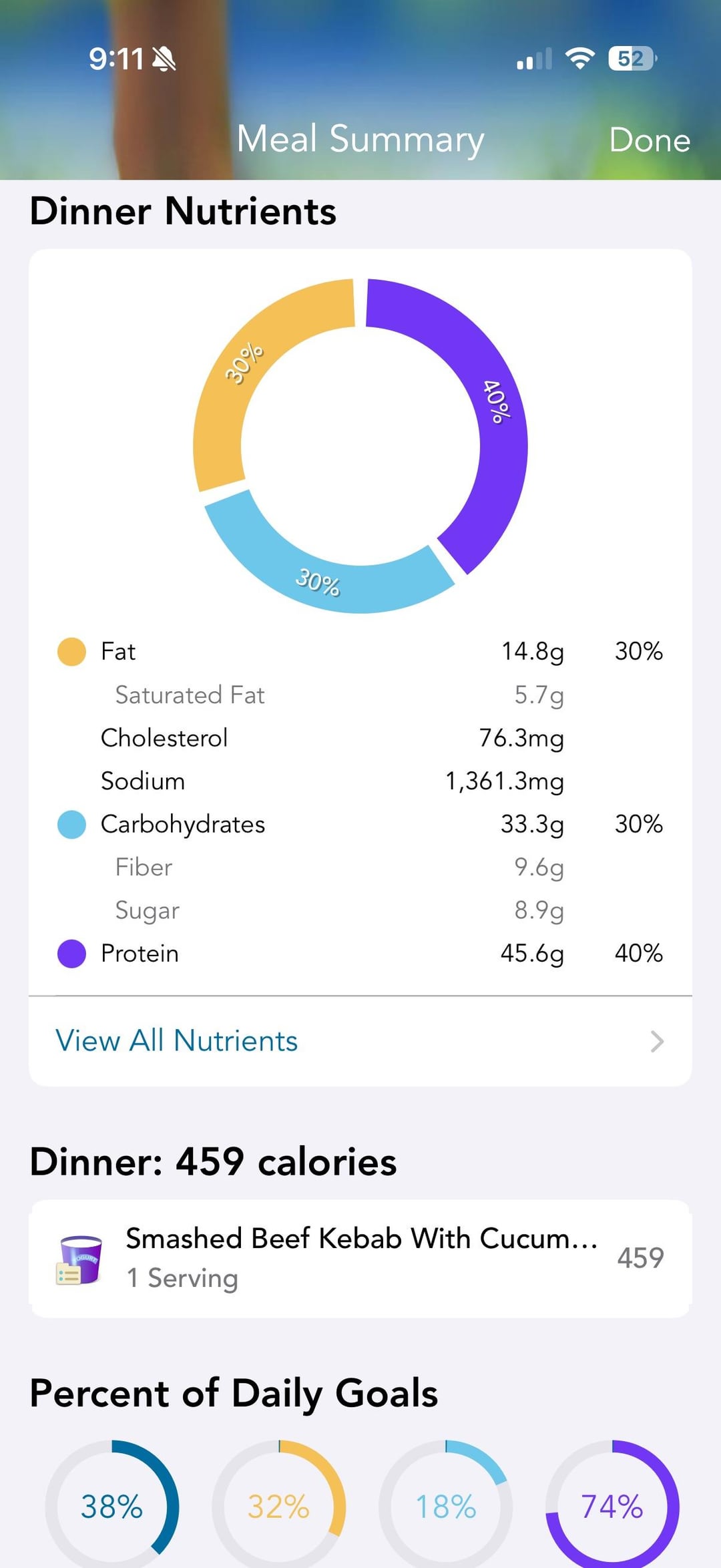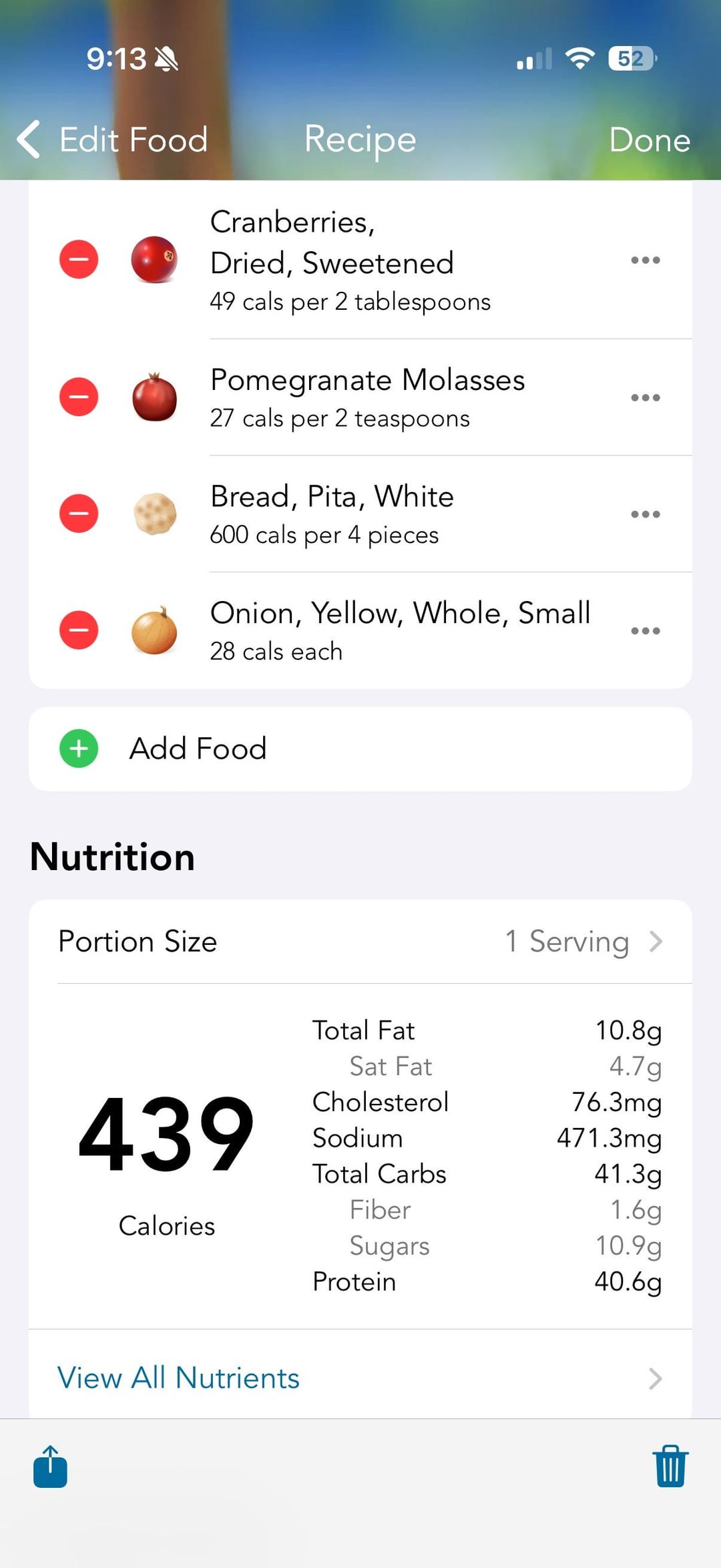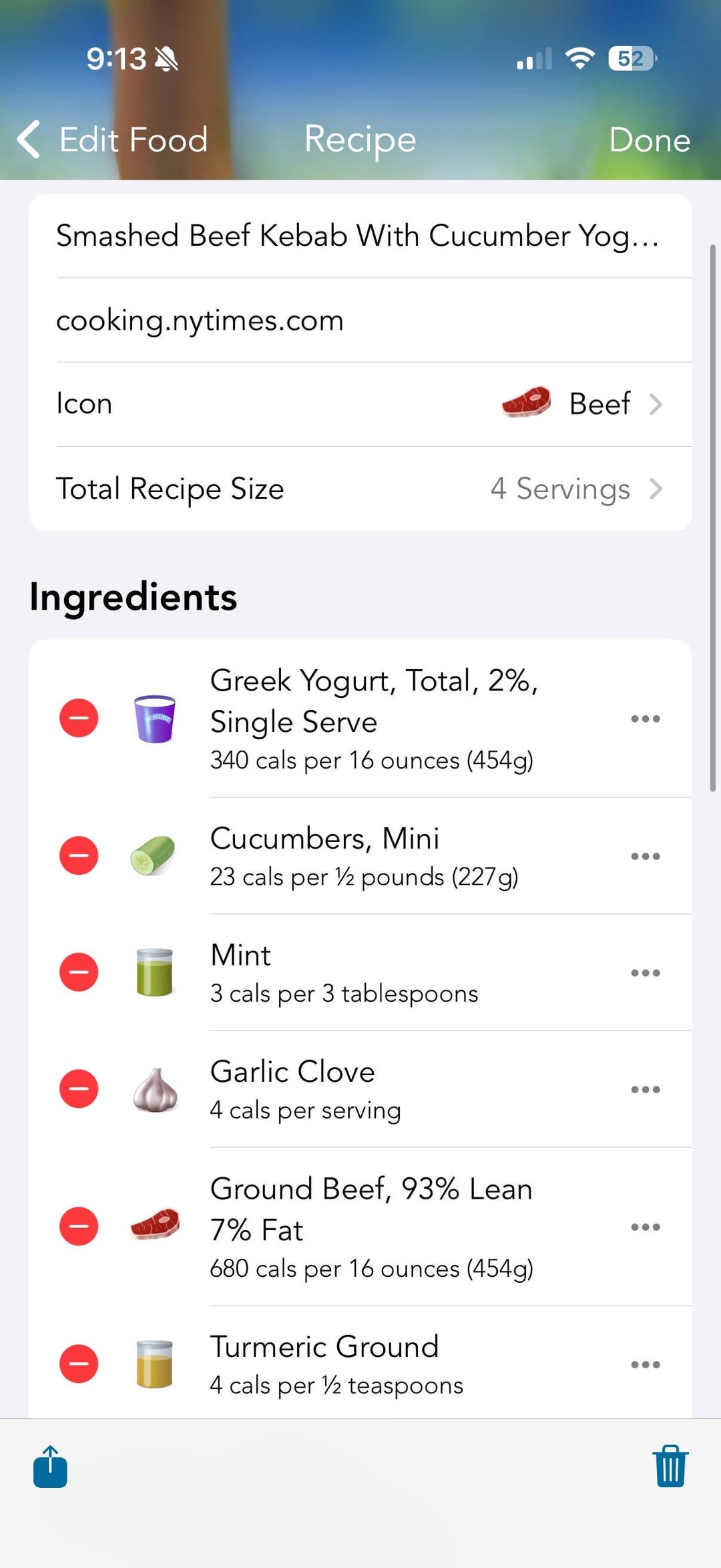 Mods to make it lower cal: 93% lean ground beef, 2% Greek yogurt, left off nuts (we were out, but love pine nuts with this). Past mods we’ve done included a keto pita for higher fiber. Keeps well for lunch the next day, too. Cannot recommend this recipe enough.