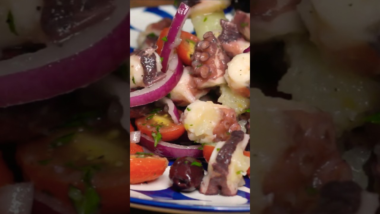 Fresh, light, and straight from the Mediterranean, this octopus salad is full of flavor. Tender octopus mixed with soft potatoes, juicy cherry tomatoes, briny calamata olives, and a touch of fresh parsley. All brought together with a drizzle of extra virgin olive oil. Want to see how to prepare it at home? Visit my channel for the full stepbystep recipe. And don’t forget to subscribe for more Mediterranean cooking