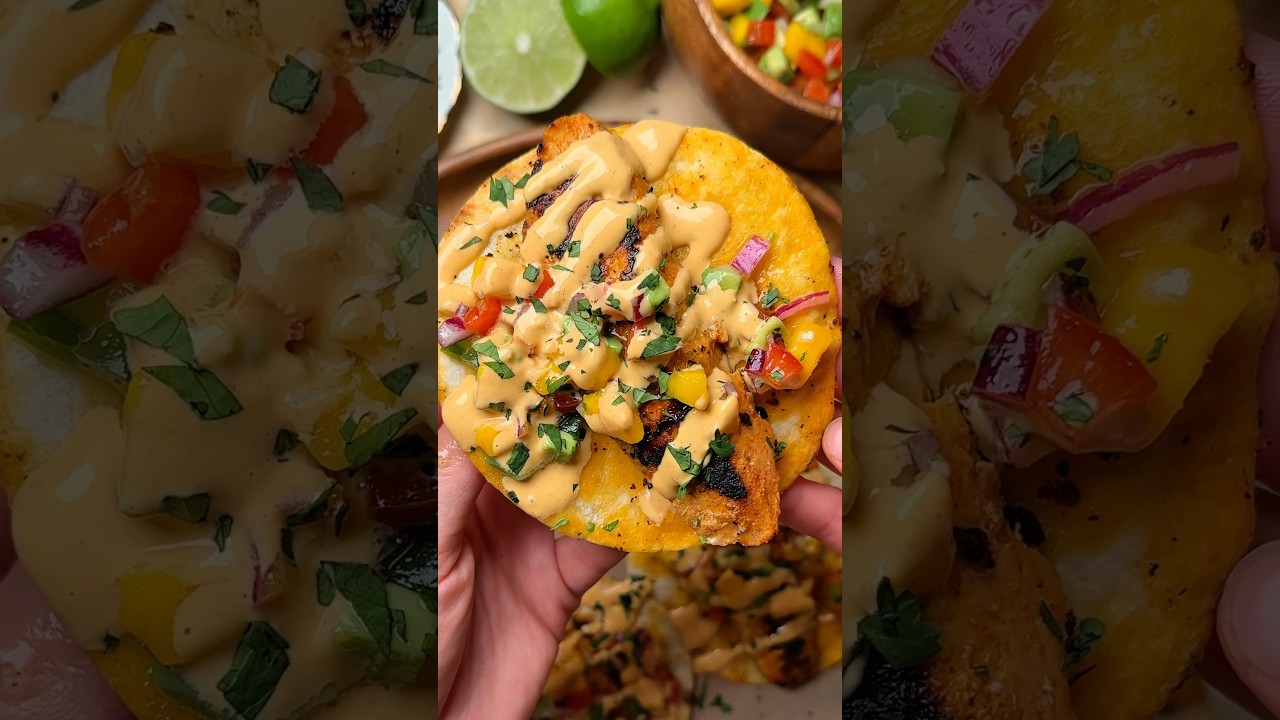 Sometimes you want fish tacos without the mess of deep frying. So, let’s make these instead. Combine avocado oil, lime juice, smoked paprika, mustard powder, onion powder, garlic powder, cumin, salt, pepper, and white pepper. Add in or cod, and sear the fish in a hot pan for a couple minutes, and use that leftover oil and flavor to toast up your tortillas. For the mango salsa, chop up some bell peppers, mangoes, jalapenos without the seed, avocado, and red onion. Dress it up with some lime juice, avocado oil, and a pinch of salt. Make the sauce by combining mayonnaise, Sriracha, a garlic clove, some lime juice, and blend that up.