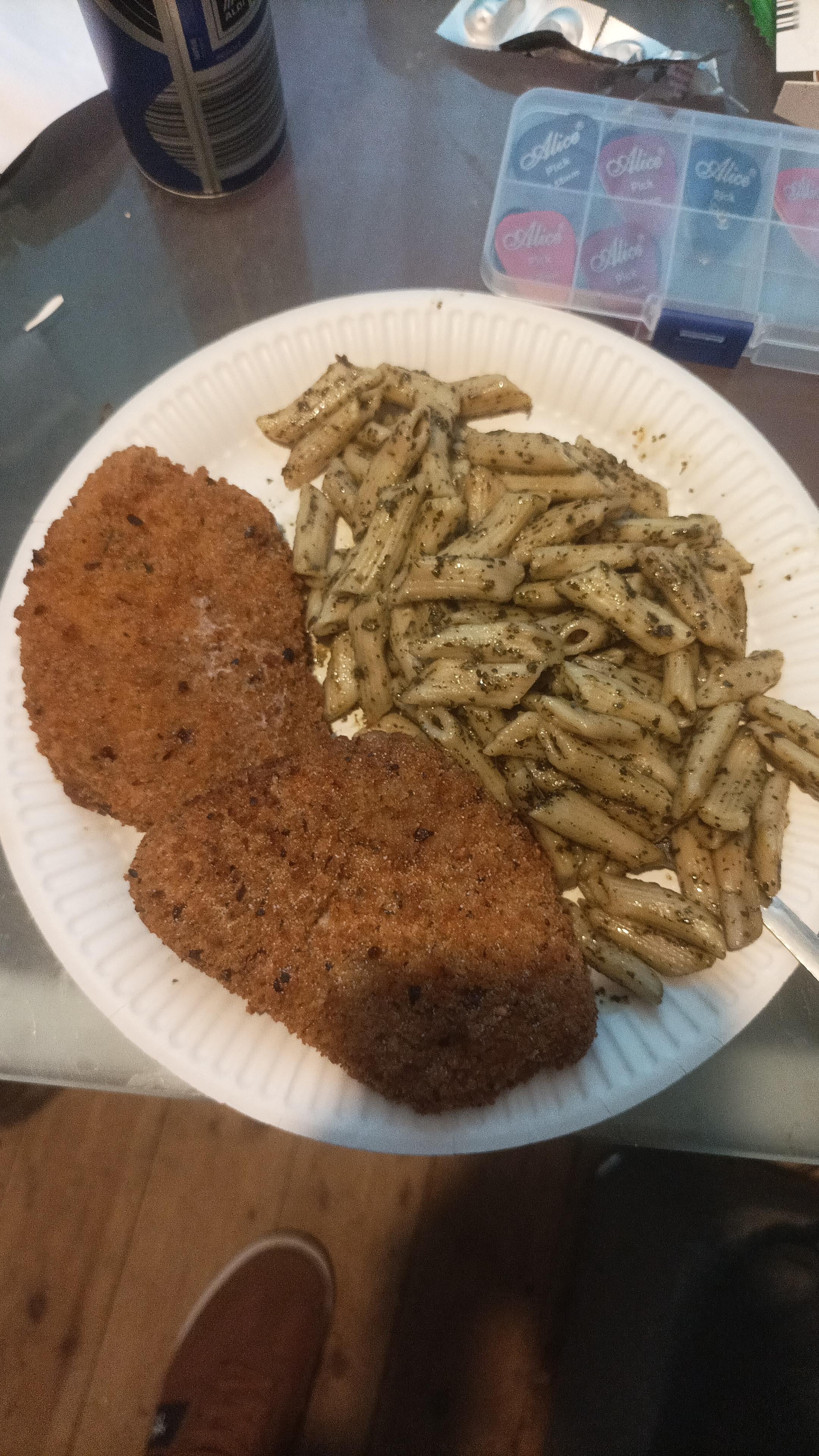 Microwave pesto pasta and air fried spicy chicken on a paper plate.