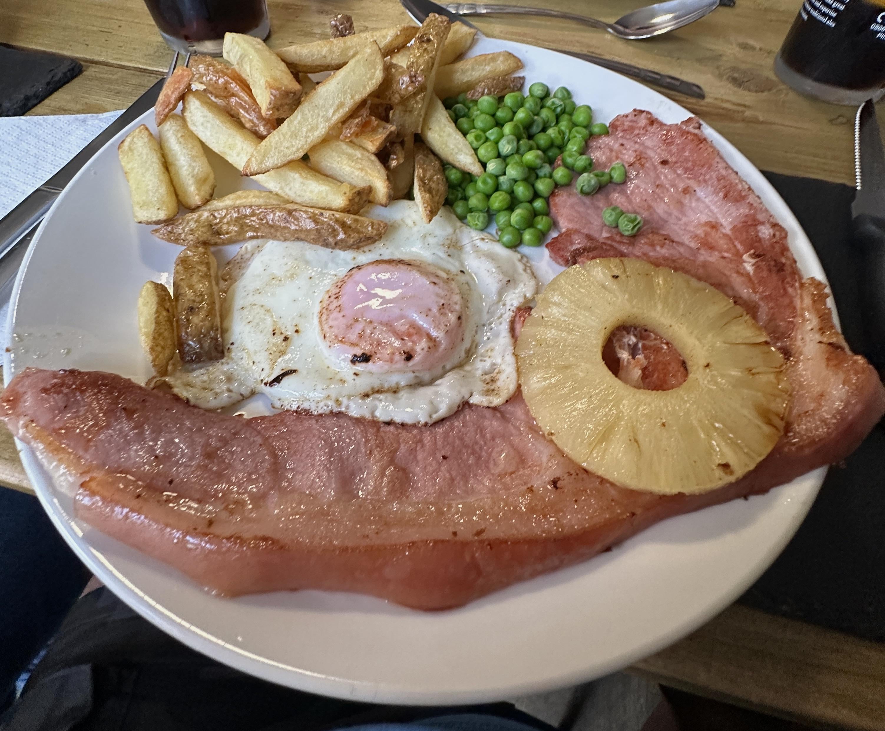 Gammon, pineapple, peas, egg & chips.