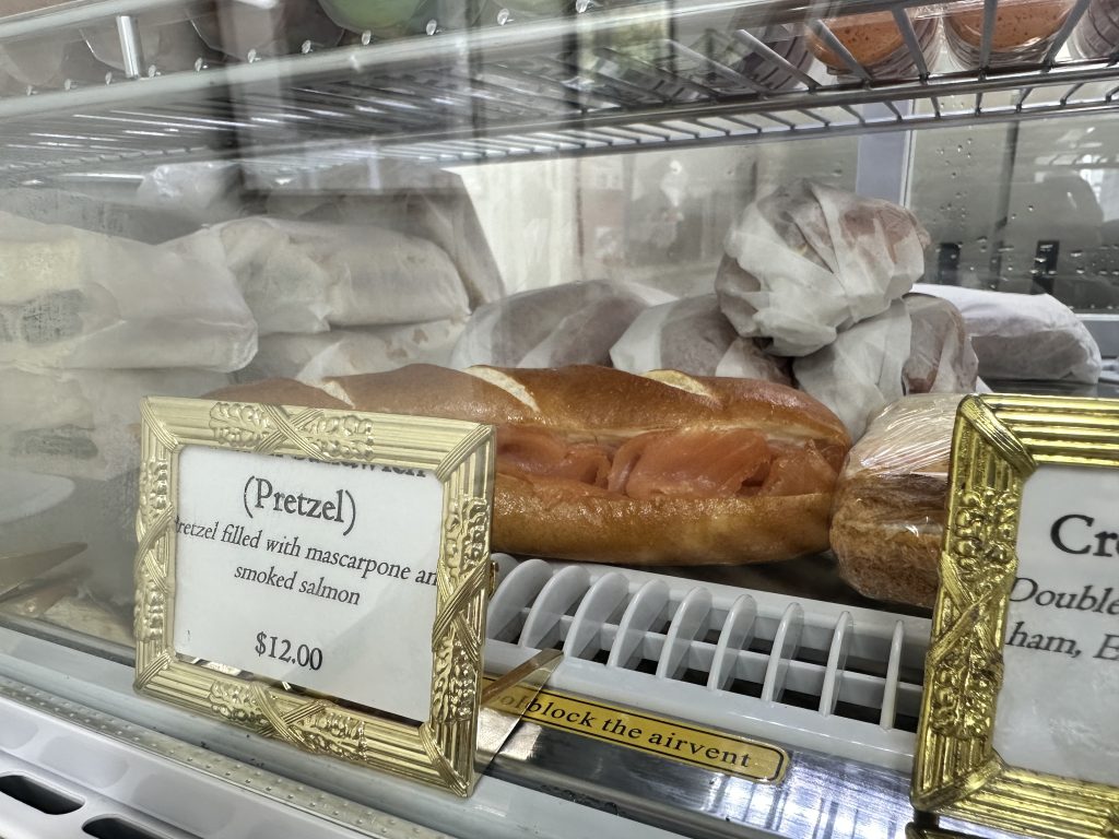 According to Dreyer, the menu also includes an unusual offering: pretzel sandwiches. The sandwiches are made with soft pretzels in the shape of a mini baguette that enclose fillings such as salmon and mascarpone or ham, butter, Emmental cheese and pickles. According to Dreyer, the pretzels (also called “Bretzels” are a popular snack in his hometown of Strasbourg, due to its proximity to Germany.