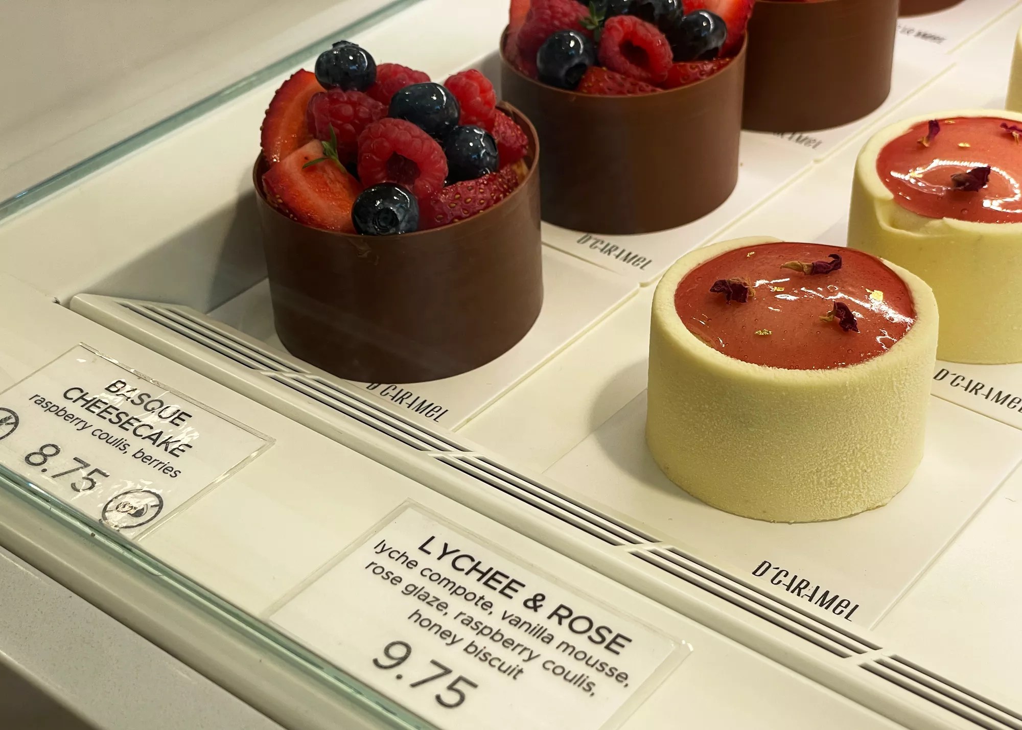 We got the coffee bean, a tiramisu made with mascarpone mousse, coffee cremeux, almond and vanilla crunch and a vanilla biscuit; the lychee and rose with a lychee compote, vanilla mousse, rose glaze, raspberry coulis and a honey biscuit; and the raspberry, which is a dark chocolate and raspberry mousse with a chocolate biscuit and raspberry coulis inside – lastly, an apple yuzu croissant.