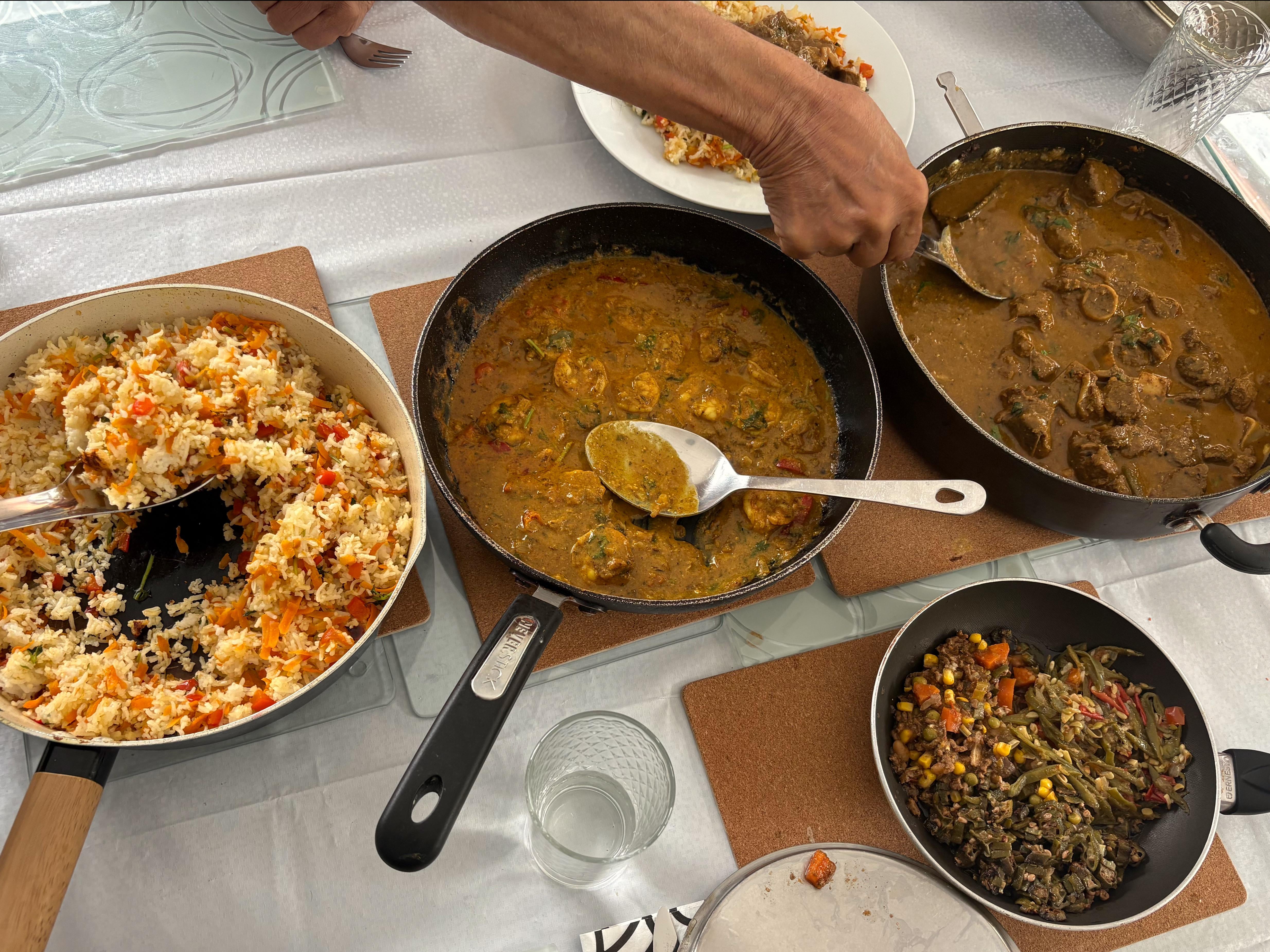 [left to right] Mixed veg rice, prawn curry, lamb curry, sweetcorn fried mince meat, garlic okro and sliced green beans.by steviecaspar Dining and Cooking
