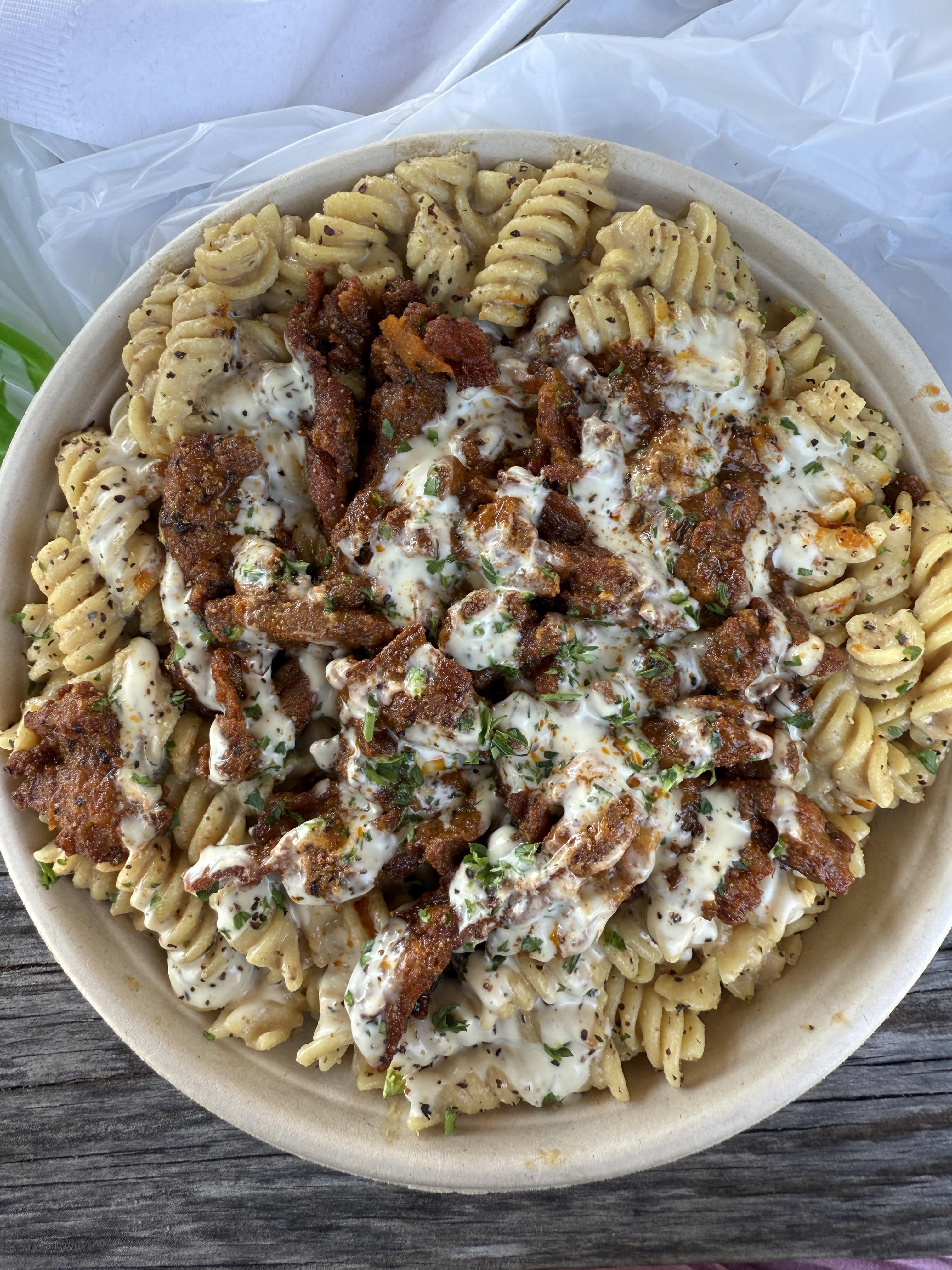 Buffalo chick’n and ranch loaded mac and cheese bowl.