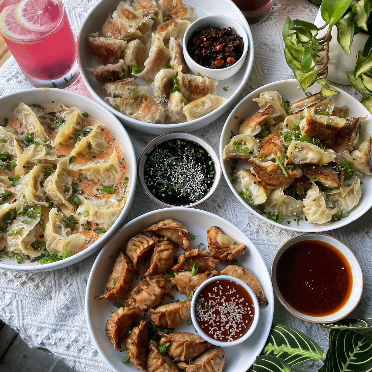 pan fried, deep fried, and thai coconut curry soup dumplings. blueberry lemonade for our drinks. served with Laoganma chili crisp, thai sweet chili sauce, chili oil, and gyoza sauce.