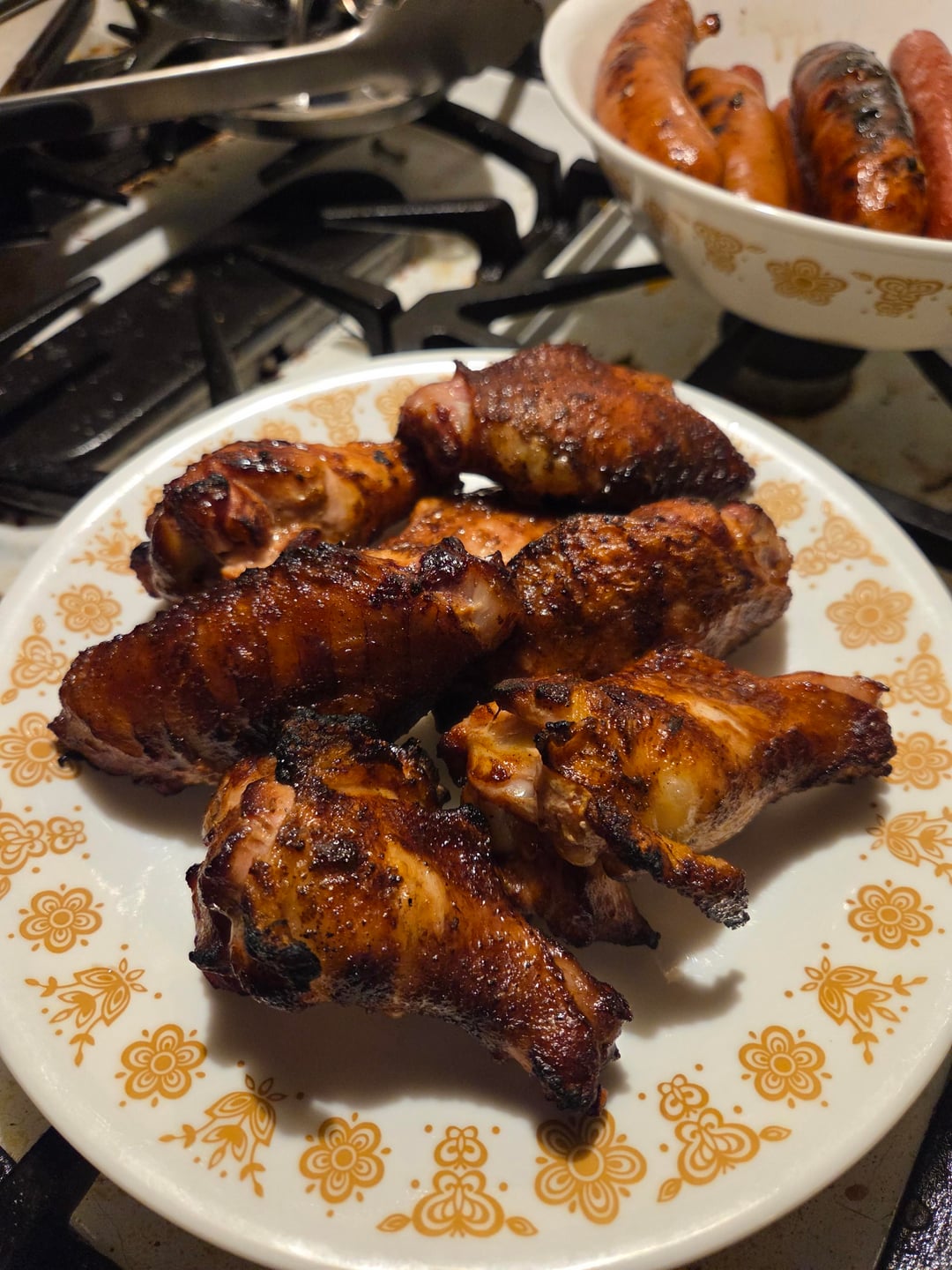 I threw a few wings on the grill tonight. Half an hour over indirect heat, then 5 minutes on the flame. Delicious!