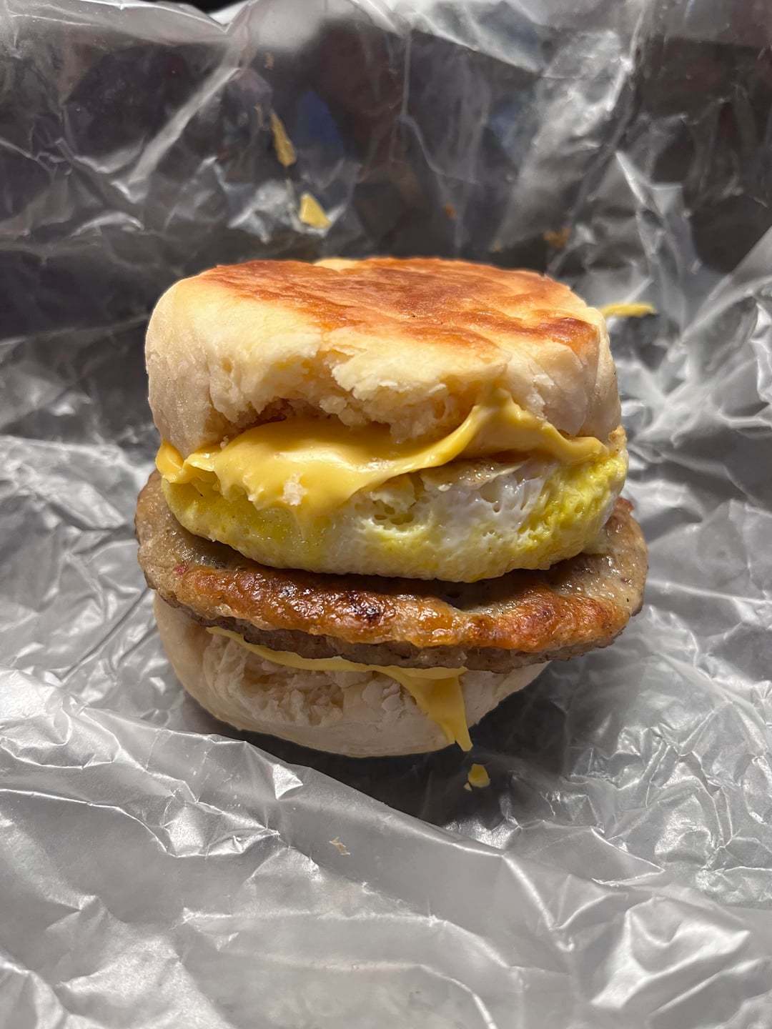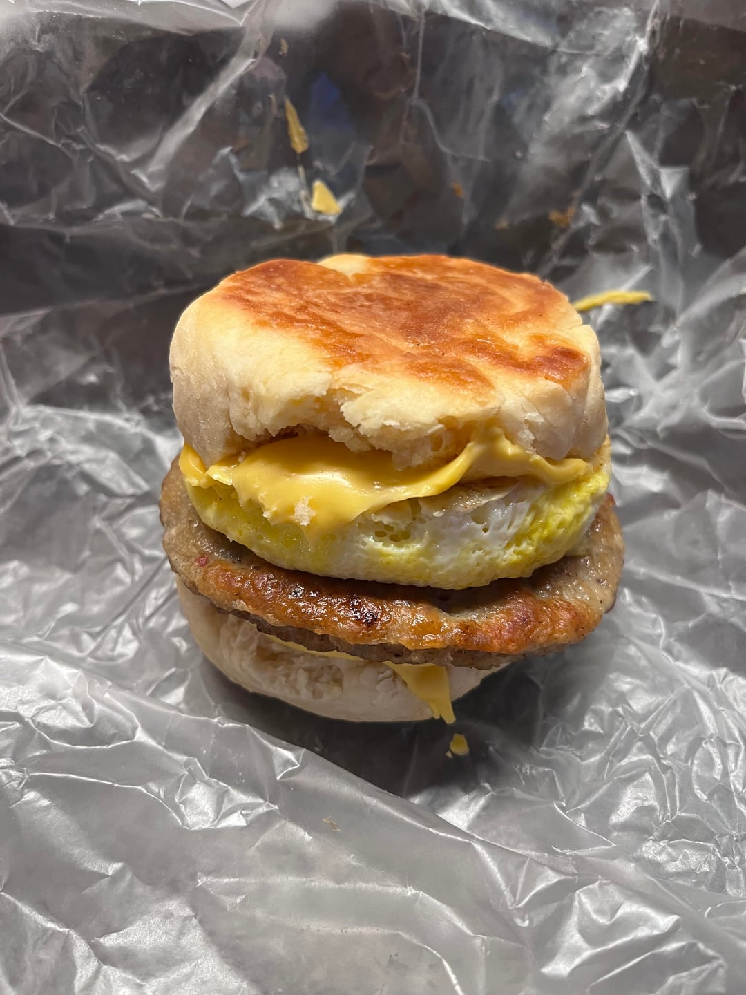 Brinner supremacy. That biscuit looks thicc and crispywas it from your freezer batch? Sausage. egg. melty American is elite comfort. Id inhale two of these, not gonna liee.