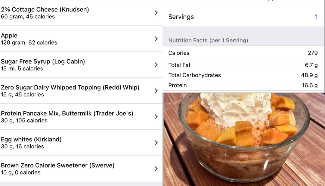 Apple Pie Pancake: 279 calories / 17g protein / 5g fiber