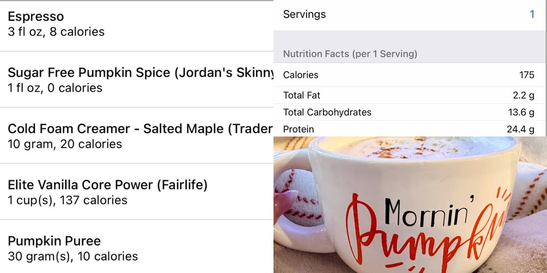 Pumpkin Spice Latte: 175 calories / 24g protein / 1g fiber
