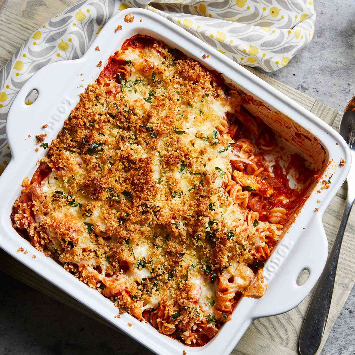 We took the best parts of chicken Parmesan–ooey-gooey cheese, crispy breadcrumbs and plenty of tomato sauce–and spun them into an easy family-friendly casserole. We skipped breading the chicken and, instead, loaded the top of the casserole with cheese and breadcrumbs.