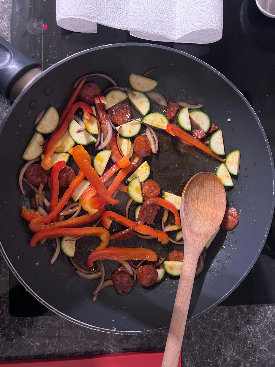 3. Add onion, red pepper, courgette and garlic. Sauté 4–5 min.