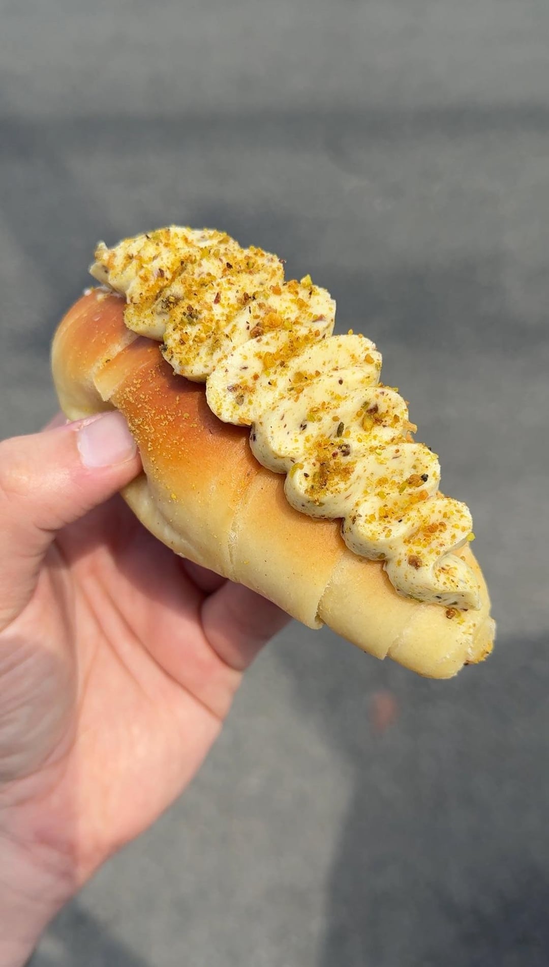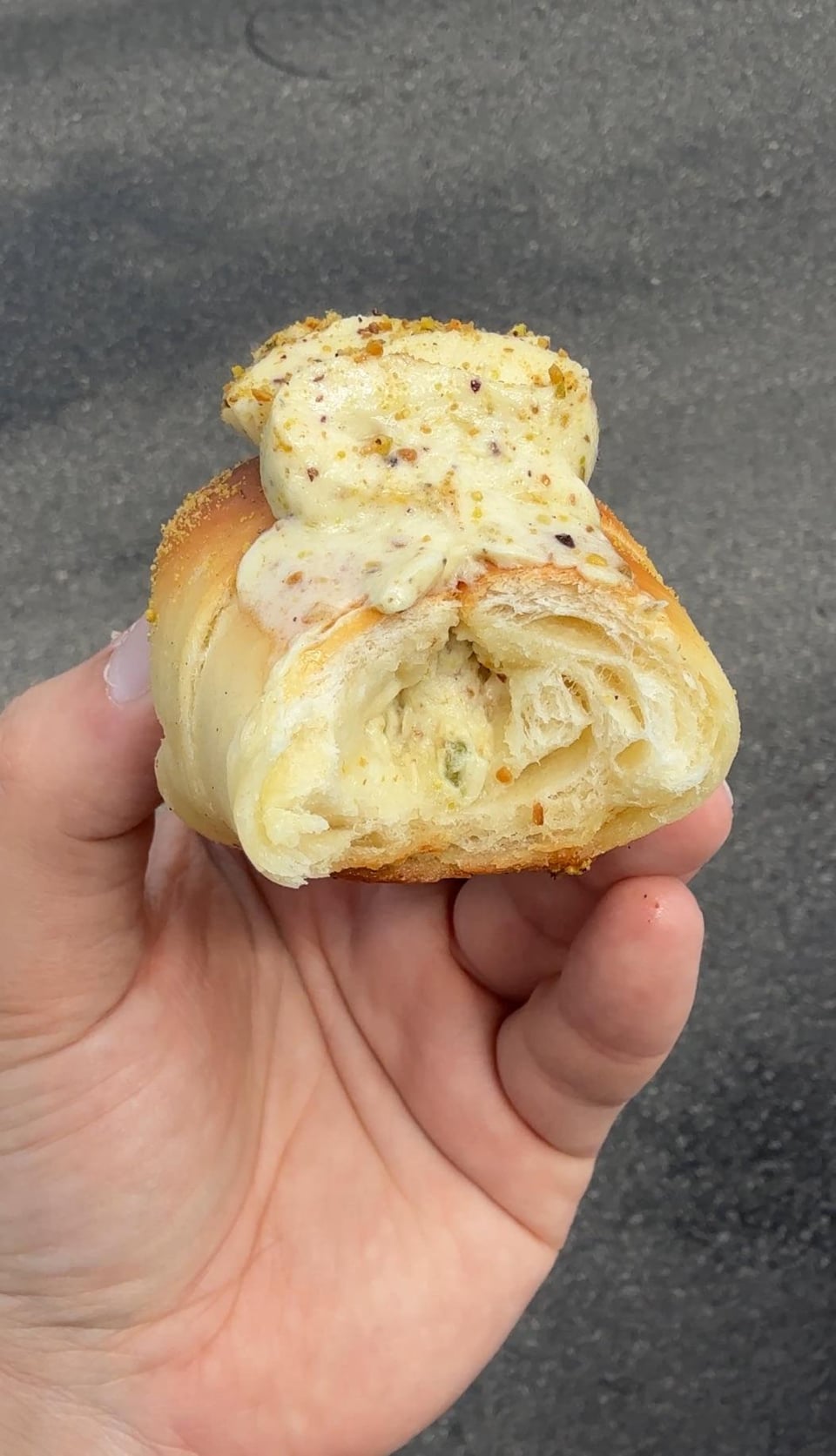 Staff is super kind and the place has great vibes. I ordered the garlic onion cream cheese and pistachio breads.