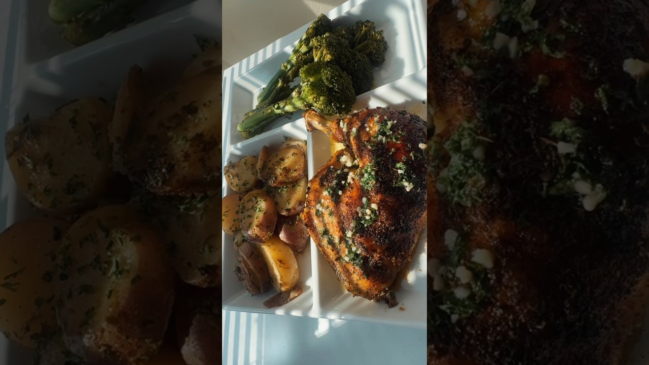 Baby, citrus herb and butter chicken will not disappoint. First, you make your garlic herb butter. You’re going to put your garlic, your cilantro, your parsley. You’re going to whip it up. Then, you’re going to cut up your citrus. Cut up your potatoes and your onion. Put that at the bottom of the pan. After you do that, you’re going to stuff that chicken and rub that bad boy with that garlic herb butter. You’re going to season it and you’re going to make sure you hit it with some oregano and some parsley on the outside as well. I made some broccolini to go with it and yeah, baby.