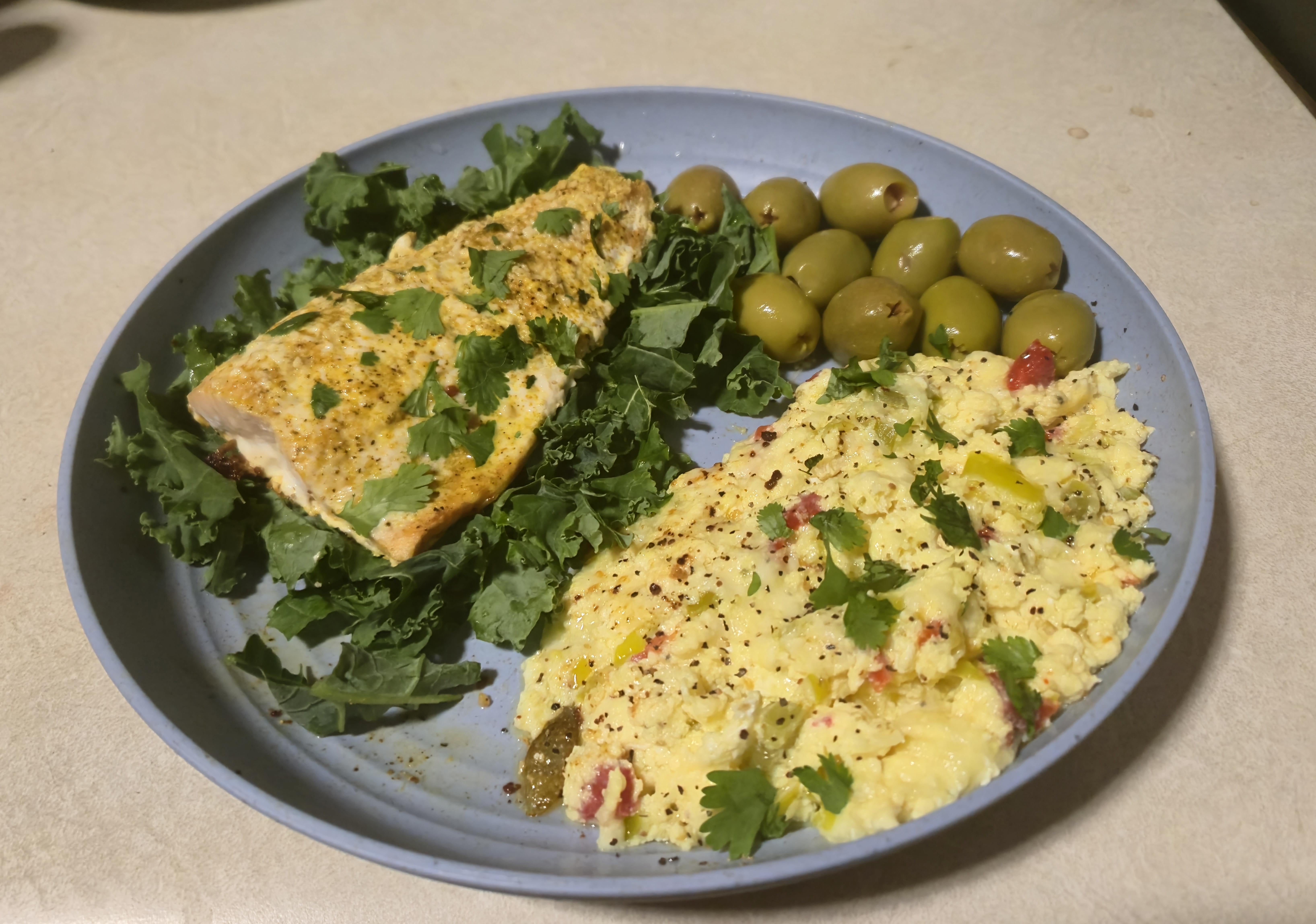 I eye balled some of the cheese and oil because I just woke up. Wanted to share. This will keep me full until dinner. Super satisfying! Parm-Crusted Salmon, loaded cheesy scrambled eggs (2 eggs+ cottage cheese), kale salad, and feta stuffed olives. I put the dressing on the salad after this picture.