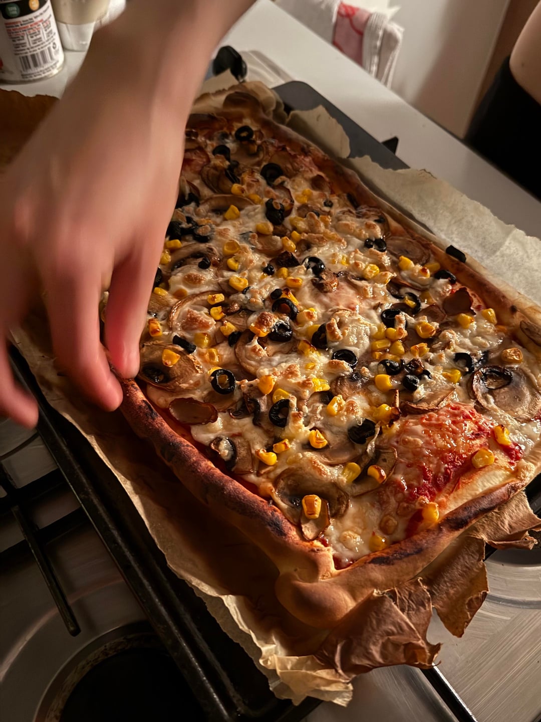 4. Sheet pan pizza topped with tomato sauce, mozzarella, mushrooms and corn