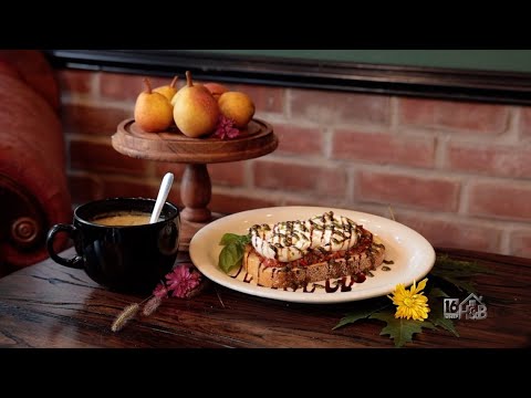 — for sure. And then we would take our parboiled barley that we’ve already made, and then we would put that in, give that a good stir, OK, and we would just let that simmer for a bit and it will get nice and thick. Really the flavors will meld and marry, and it’ll be a nice great dish for fall. Warm. This looks fabulous. Thank you. Yeah, that’s our hearty fall soup, and we thought it would pair well with our burrata bruschetta toast. This looks phenomenal. Thank you. Yeah, it’s worthy for sure. So that’s a fresh bruschetta that we make here, local farm grown tomatoes, fresh basil paired with the pesto that we also make ourselves on top we have. The drizzled with balsamic glaze and what better than for fall but homemade cinnamon bun which when we started making these people were just buying them as soon as they were coming out because they just smell so good but there’s nothing really nothing better than a freshly iced cinnamon bun. On a day like this, and the only other thing I would say is let’s get some sort of a coffee to go with this. Some fall themed concoction that we’ll make up for you. This is fall bliss right here. Yes, absolutely. So what you’re inspired is a coffee shop that serves breakfast and lunch, as I said before, everything is made to order. One of our daily specials is the all American grilled cheese sandwich with a nice cup of tomato bisque soup, and it’s been a real crowd pleaser. Sometimes over the weekends we feel like a grilled cheese factory, but people are really loving it, and it’s, it’s a big comfort food. — It’s a