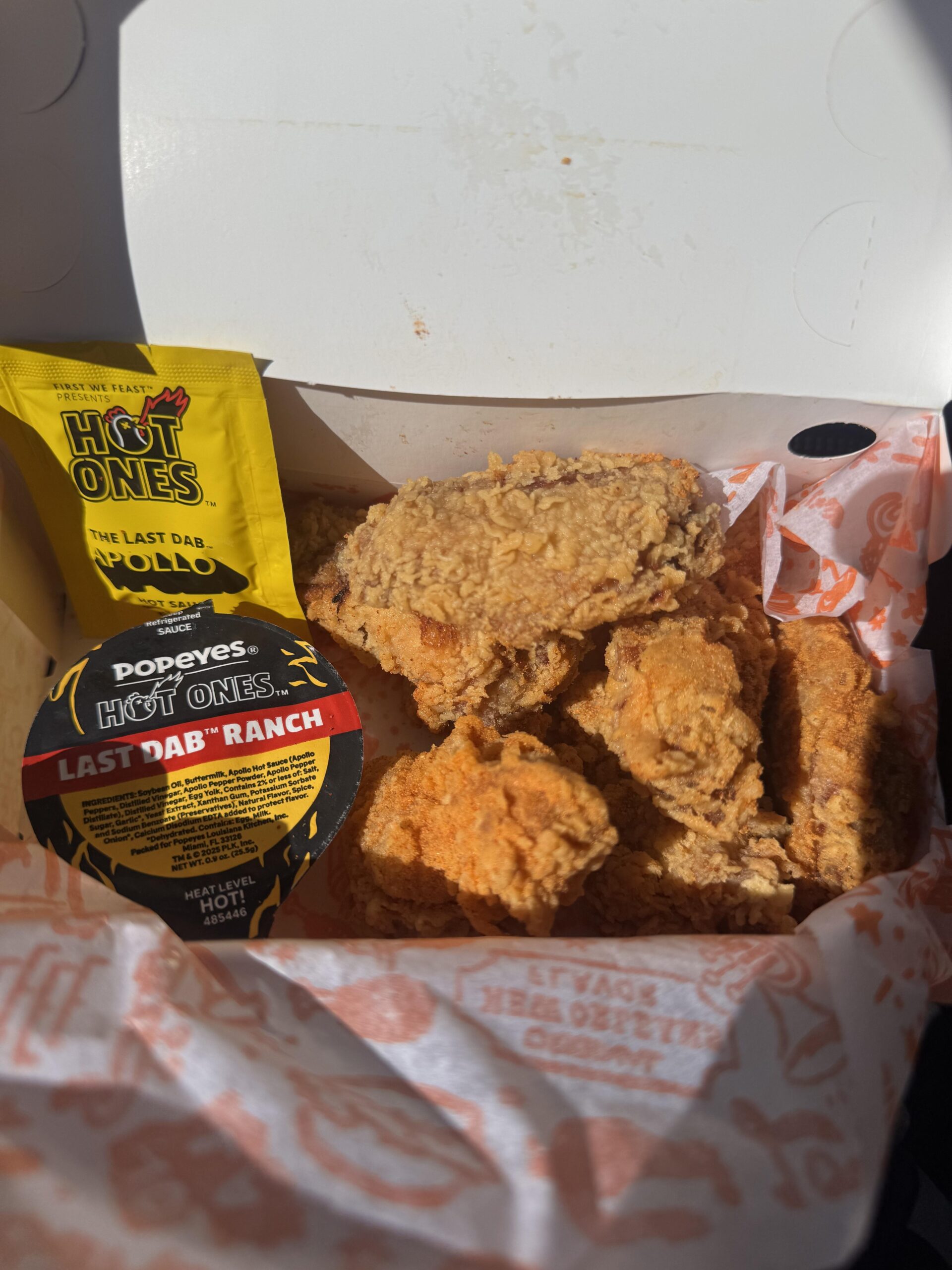 The Apollo is actual strength, not diluted for Popeyes so that was cool. The ranch had a surprising kick too. The wings themselves had little to no heat.