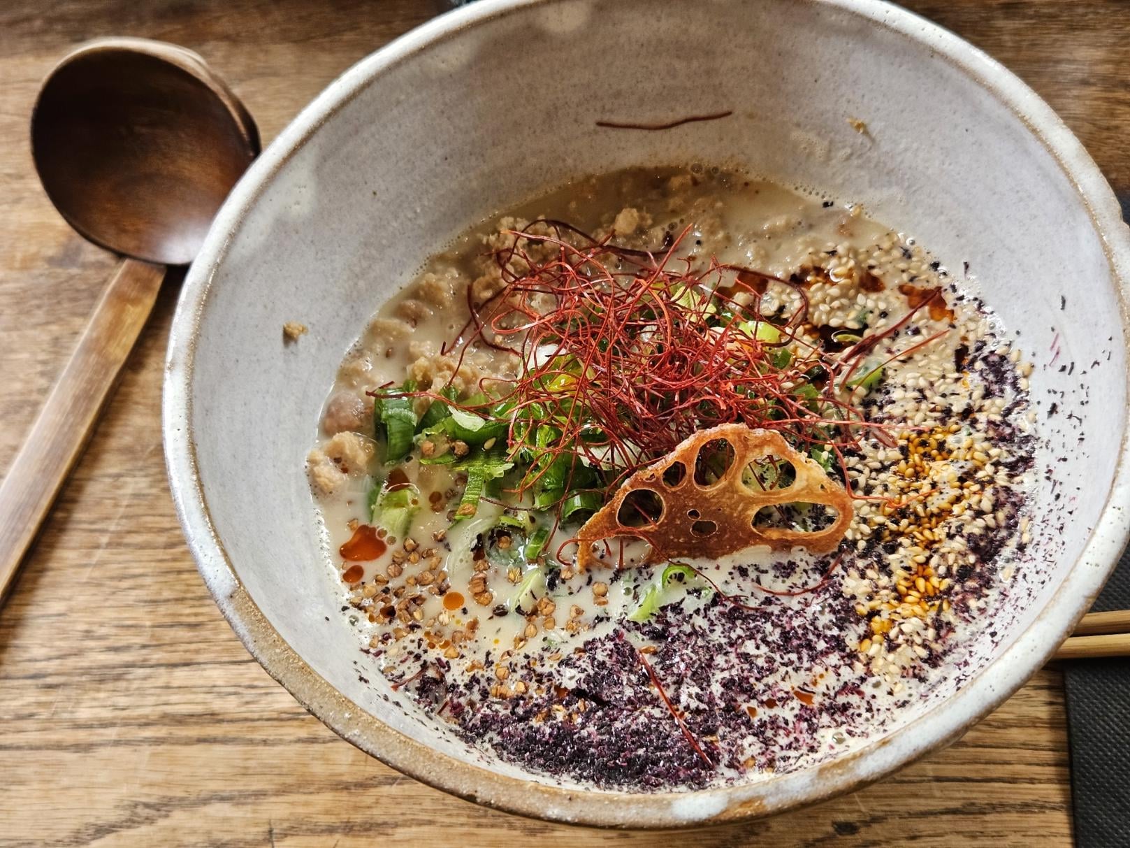 Broth made with miso, tahini, kombu, ginger, garlic and oatmilk. Topping : green onion, vegan meat, renkon chips, spicy oil, buckwheat seed, shiso, sesame seeds, togarashi