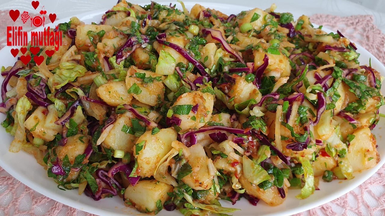 Elif’in mutfağına hoş geldiniz. Bugün sizlerle her türlü sofranıza çok yakışacak. Bir püf noktası sayesinde inanılmaz lezzetli, bir kez denediğinizde sizlerin de vazgeçilmez tariflerinizden biri olacak. Patates salatası tarifini paylaşmak istiyorum. 7-8 adet orta boy patatesi yaklaşık 1 kilo kadar iyice yıkayarak tencerenin içerisine aldım. Üzerini geçecek kadar su ve 1,5 tatlı kaşığı kadar tuz ekledim. Ocağa alalım. Patatesler yumuşayana kadar haşlayalım. Haşlanan patateslerin kabuklarını soyalım ve küp küp doğrayalım. Patatesleri çok soğutmadan ılıkken doğrayalım. Daha sonra üzerine birer çay kaşığı kadar tuz, karabiber ve pul biber ekleyelim. Asıl salatamızın lezzetini veren en önemli püf noktası tavanın içerisine bir dolu yemek kaşığı biber salçası ekleyelim. Domates salçası olmaz. Biber salçası kullanalım. Üzerine bir çay bardağından bir parmak eksik ben zeytinyağı ve sıvı yağı karışık kullandım. Salçanın üzerine ekleyelim. Orta ateşte sürekli karıştırarak birkaç dakika kadar salçayı yakmadan kavuralım. Salçamız hazır. Ocaktan alalım ve hemen sıcakken sıcak salçayı ılık patateslerin üzerine dökelim. ve güzelce karıştıralım. Daha sonra patatesimizi bir kenarda ılınmaya bırakalım ve salatamızın yeşilliklerini hazırlayalım. 56 dal taze soğanı ince ince doğrayalım. Bir adet küçük boy kuru soğanı da ince ince piyazlık şeklinde doğrayalım. İsterseniz mor soğan da kullanabilirsiniz. Daha çok yakışacaktır. Ve bir demet maydanozu da yine ince ince kıyalım. Videoda gördüğünüz gibi bir parça kırmızı veya bir diğer adıyla mor lahanayı da yine incecik olacak şekilde doğrayalım. Ben 4 yaprak kadar marul kullandım. İsterseniz kıvırcık veya göbek salata da kullanabilirsiniz. Orta incelikte doğrayalım. Marul veya kıvırcık kullanacaksanız iç kısımlarından kullanın ki salatanın içinde daha diri kalması için. Ilıan patatesin üzerine 1 adet büyük boy taze sıkılmış limon suyu ekledim. Daha sonra doğradığımız yeşillikleri üzerine ekleyelim ve salatamızı güzelce ezmeden karıştıralım. Bu aşamada tadına bakıp tuz ve limon miktarını kendi damak zevkimize göre ayarlayalım. Ben tekrardan biraz tuz ve biraz da limon suyu ekledim. Tekrardan karıştıralım. Salatamızı servis tabağına alalım. İnanılmaz lezzetiyle salatamız servis için hazır. Bir kez denediğinizde eminim ki sizler ve sevdikleriniz de çok beğeneceksiniz. Deneyecek olanlara şimdiden afiyet olsun. Videomu buraya kadar izleyip beğendiyseniz beğeni, yorum ve paylaşımlarınızla bana destek olabilirsiniz. İzlediğiniz için ve ilginiz için teşekkürler. Yeah.