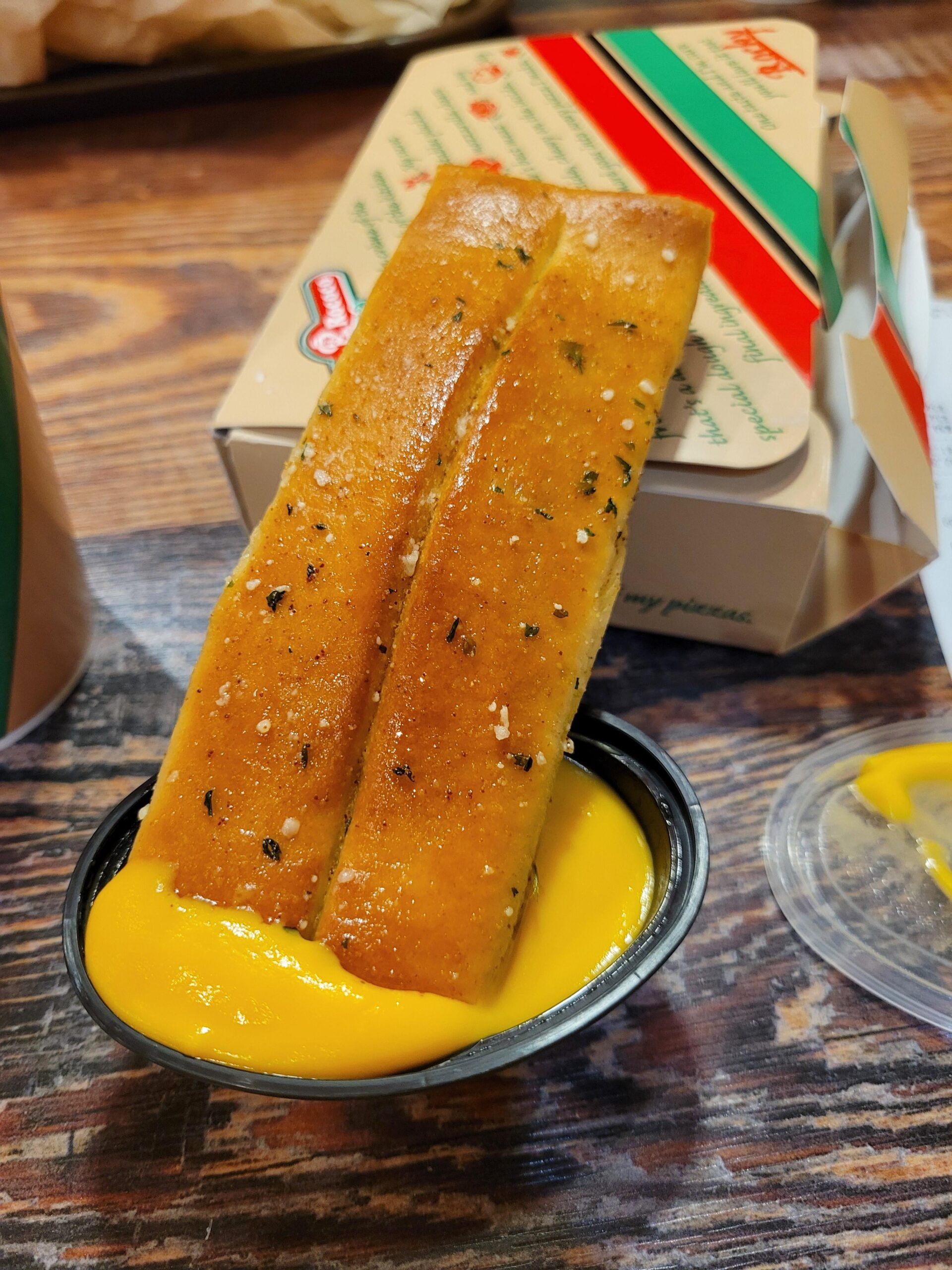 Beautiful breadsticks dipped in fake cheesiness. But there’s no reason to not appreciate nacho cheese sauce.by Lijey_Cat Dining and Cooking