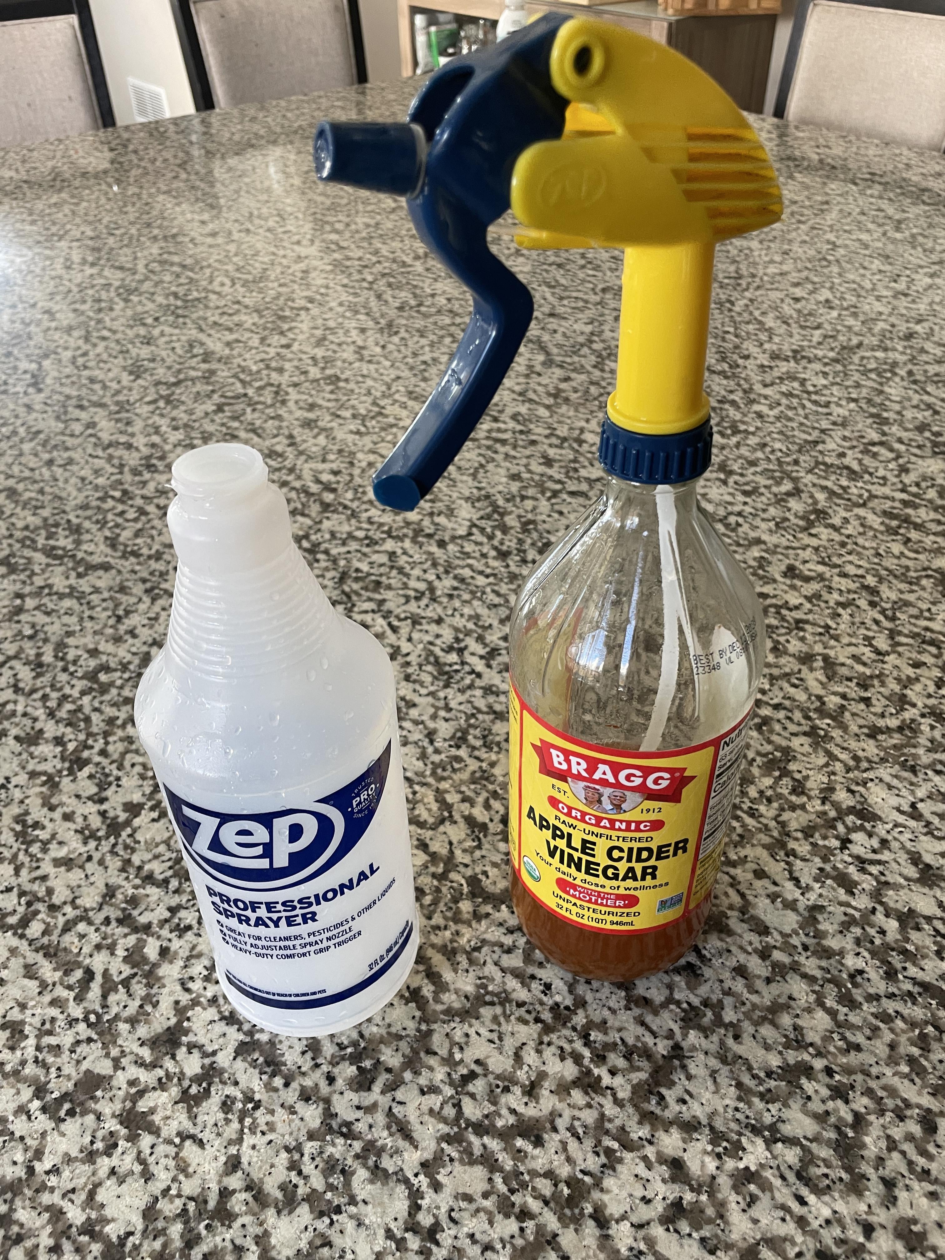 I was about to fill up my sprayer bottle for spritzing and noticed that the nozzle threads looked about the same size as the mouth of the ACV bottle. Sure enough, the Zep Professional Sprayer Nozzle screws perfectly onto the 32 oz bottle of Bragg apple cider vinegar!