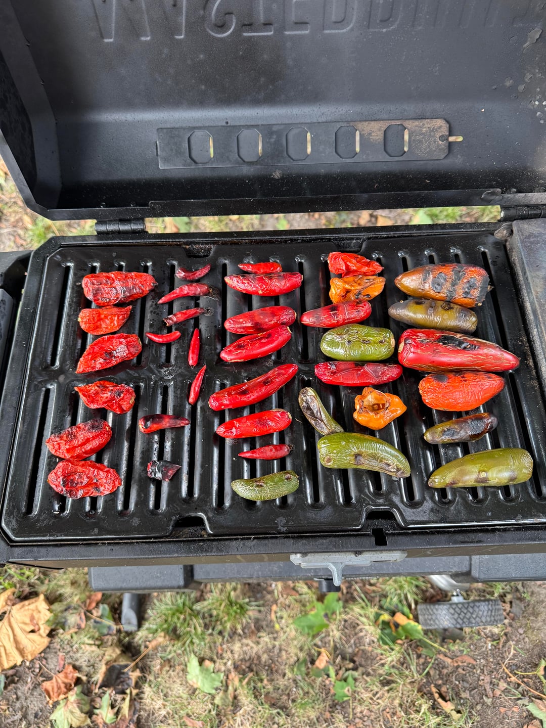Fired up the hopper with charcoal and hickory chips and smoked a medley of peppers including ghosts, habañeros, serranos, jalapeños, and Birds Eye chilis.