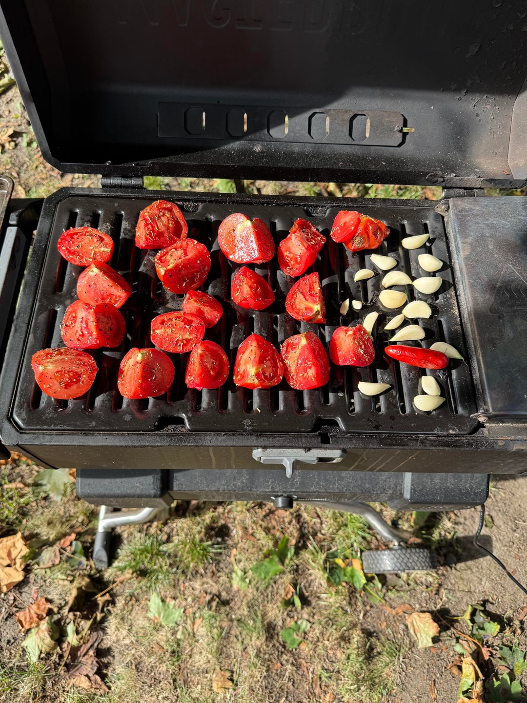 Smoked a medley of tomatoes, two gloves of garlic, and an onion.