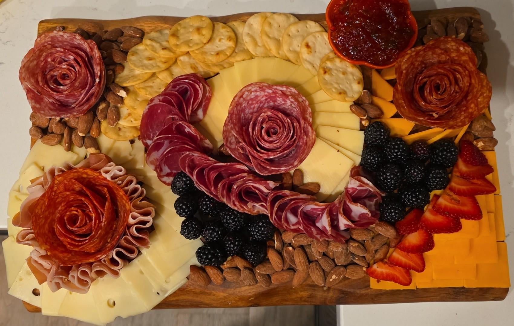 The strawberries will bleed into the cheese. The meat flowers look like they’ll get sweaty. OK if being served immediately