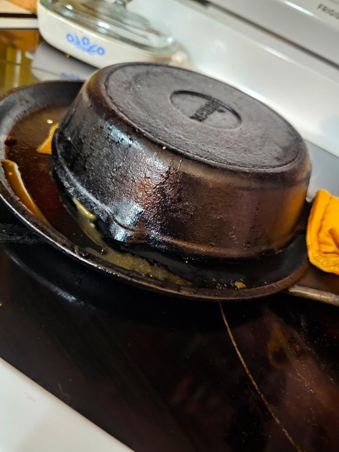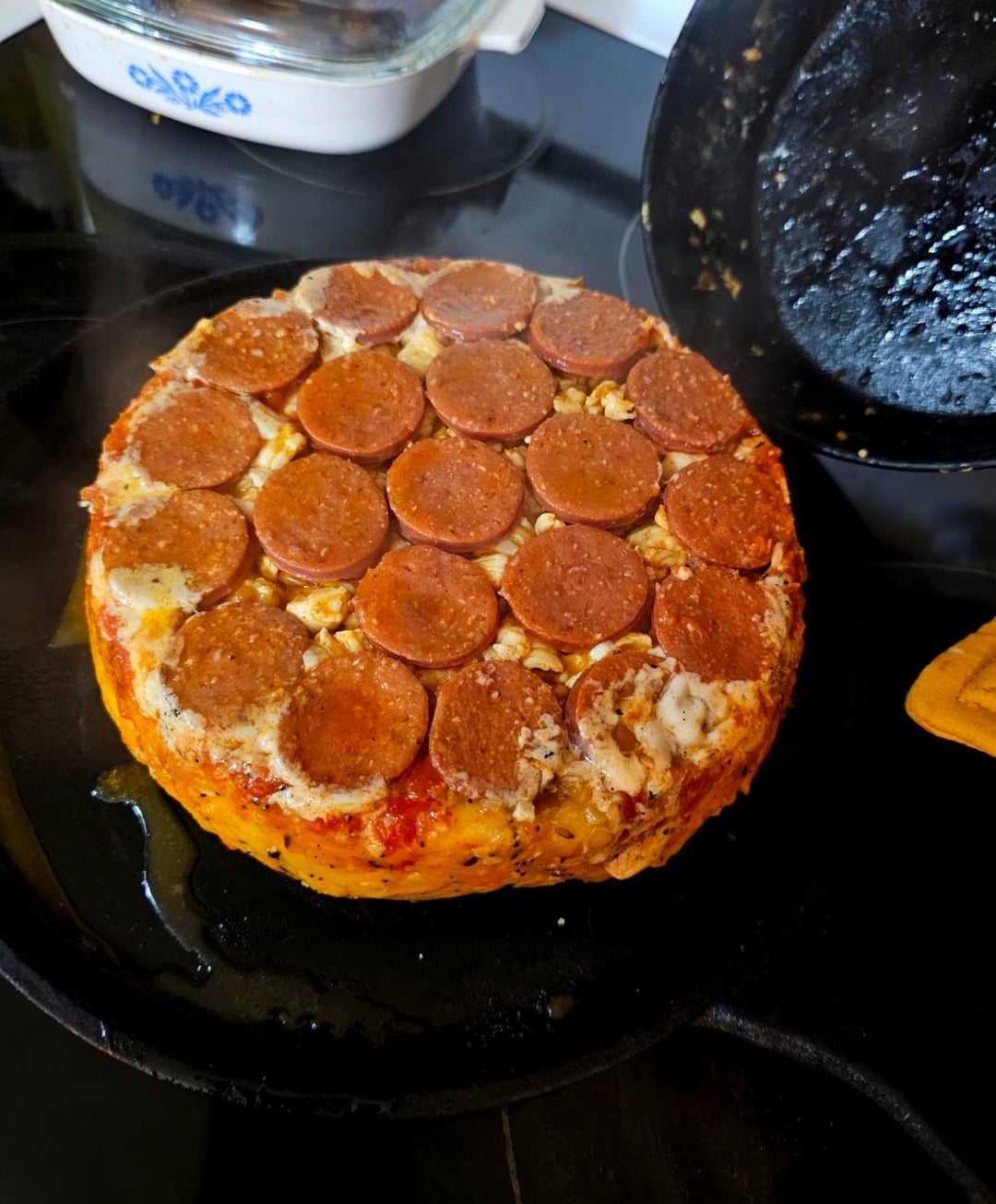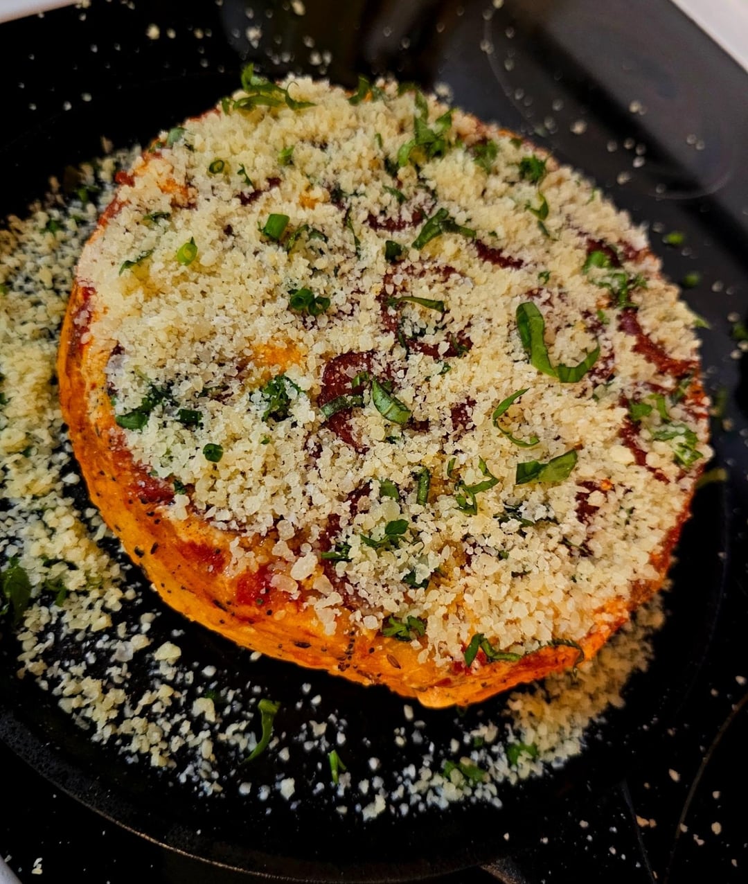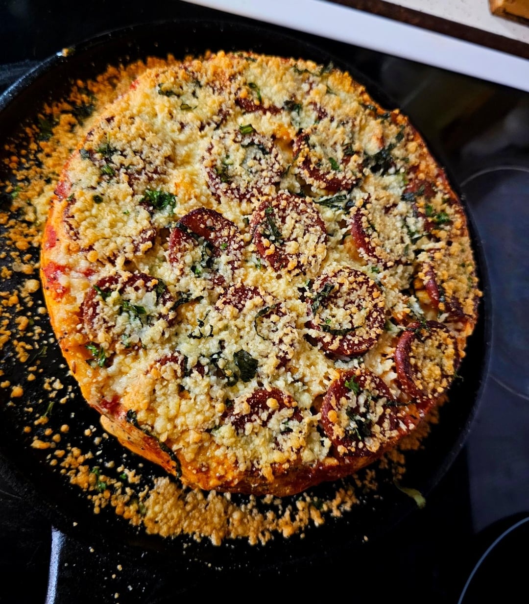 Flip it and it should fall out, back in the oven crisp up the pepperoni. Once it starts to cup pull it out, cover with parm and sprinkle of herbs then back in the oven turned off until the parm starts to brown.