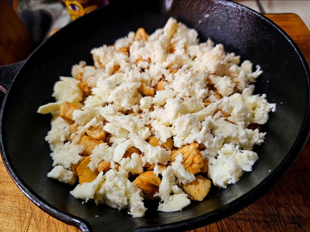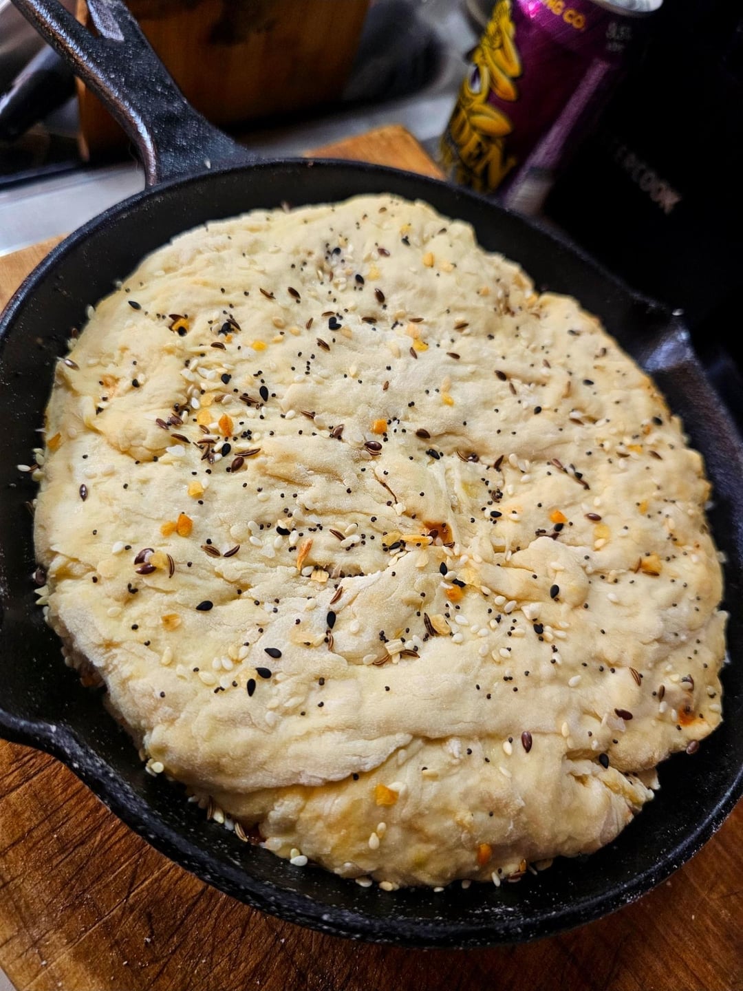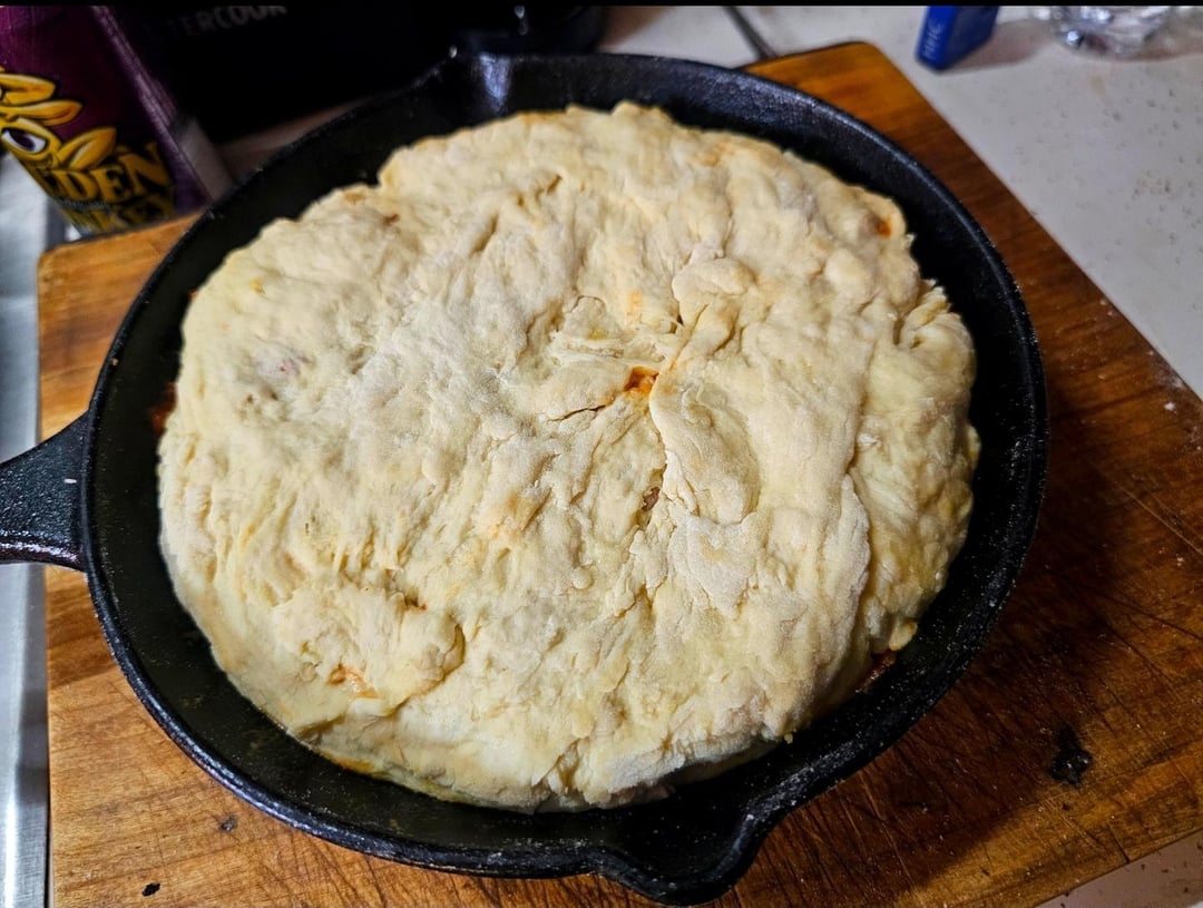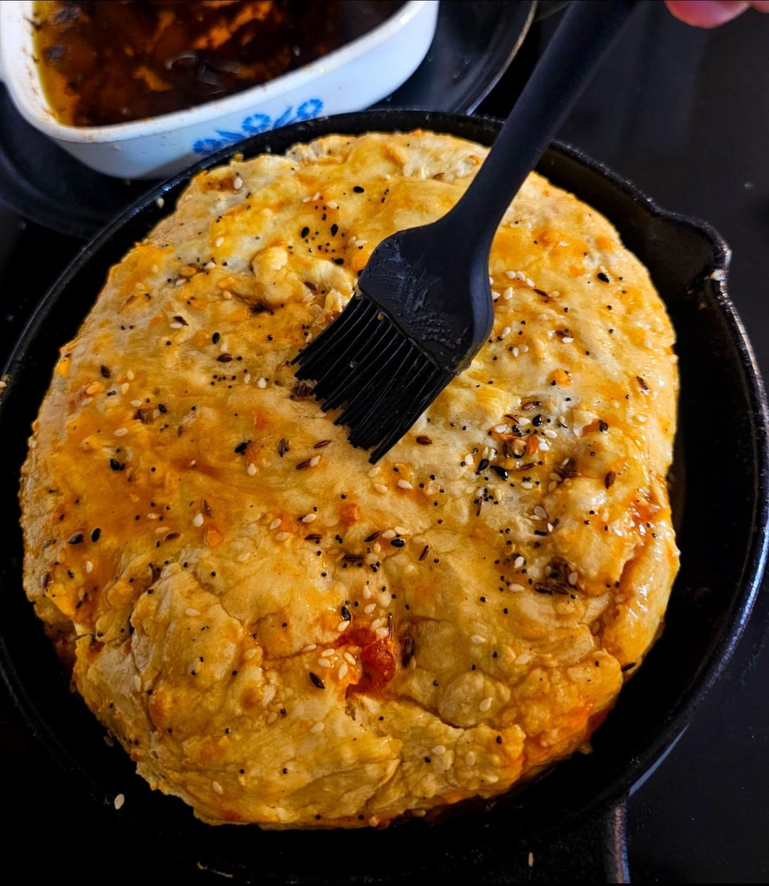 Cover with dough and tuck it down the sides, sprinkle of everything bagel seasoning, brush with oil, then cover with a skillet and bake @ 350Β° until the crust is done.
