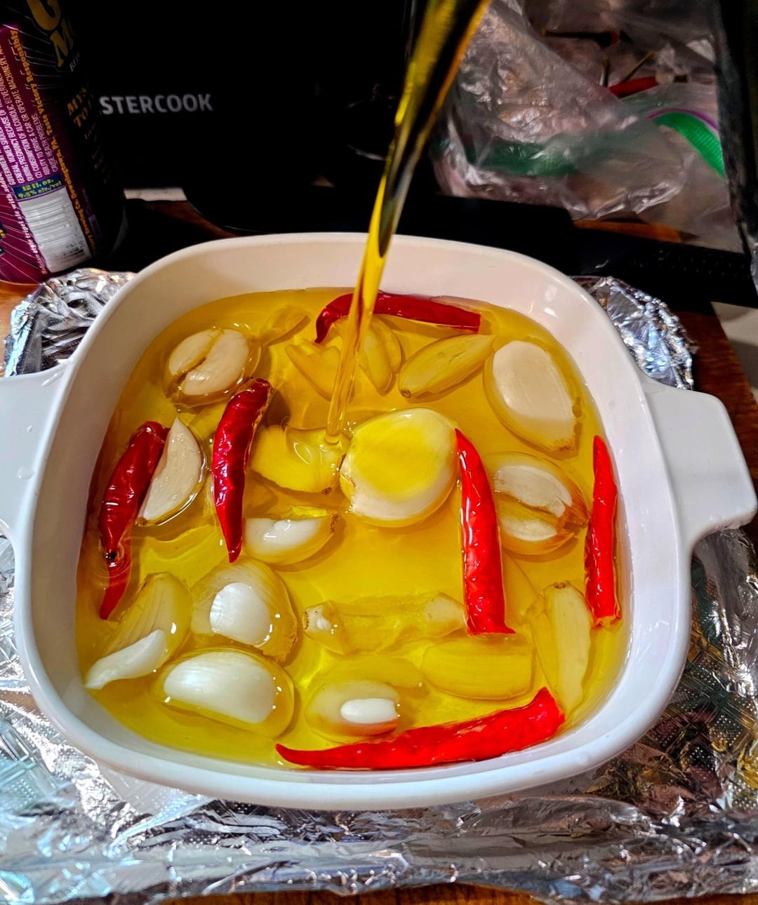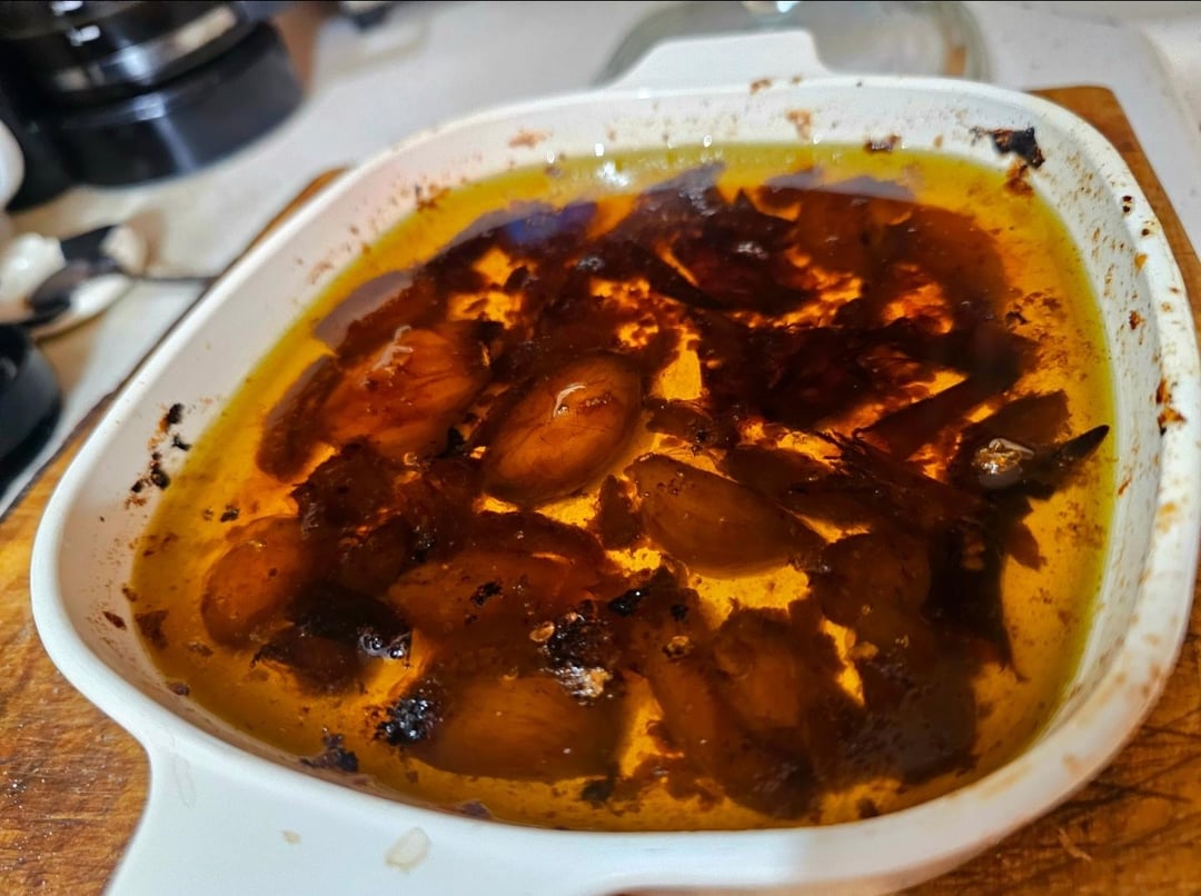 The garlic and chili olive oil is optional but I was making it anyway so figured I may as well use it π cover some chilis and garlic cloves in a baking dish filled with olive oil and leave it in the toaster oven at 250Β° until it smells good and the garlic gets soft.