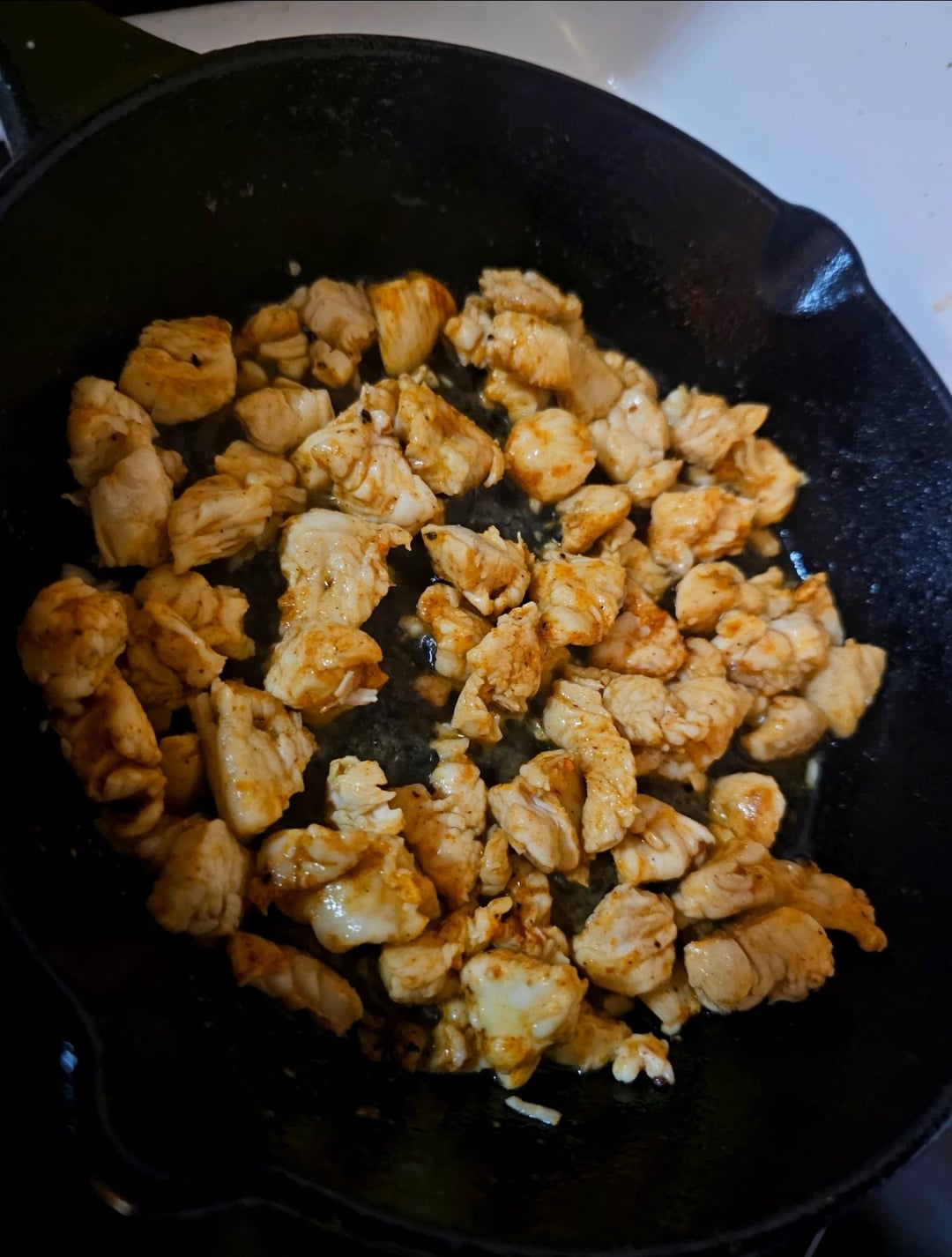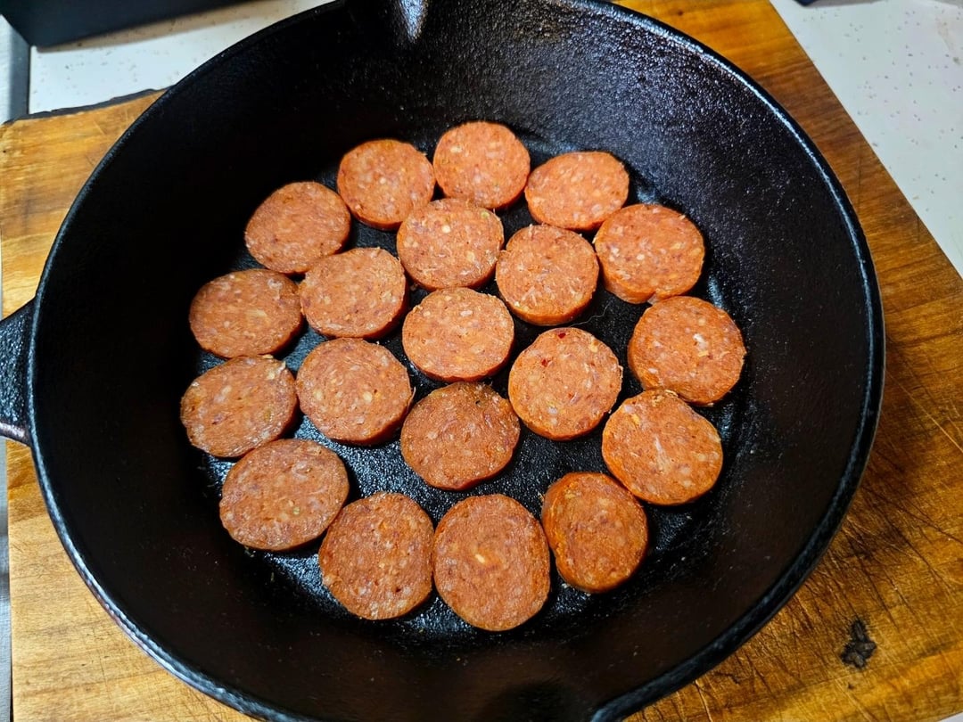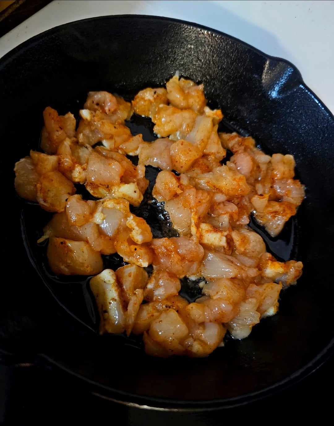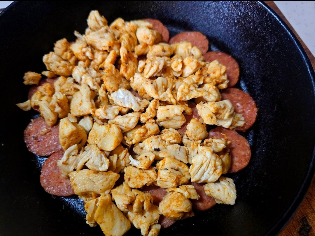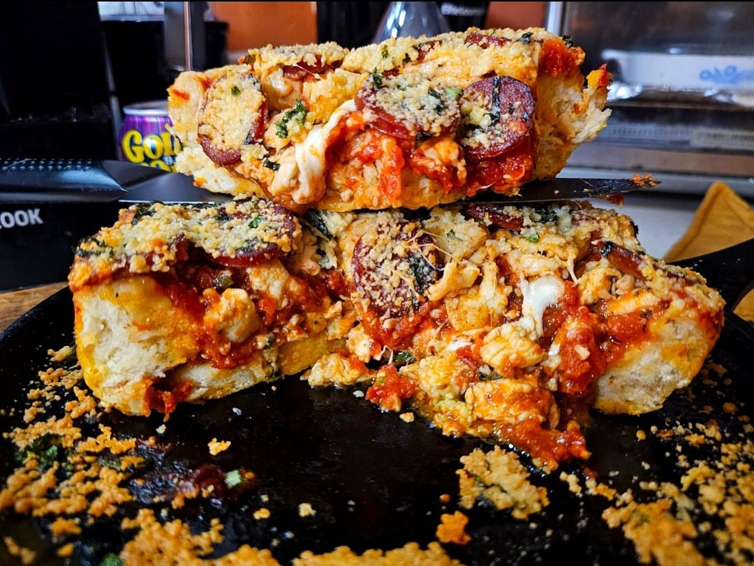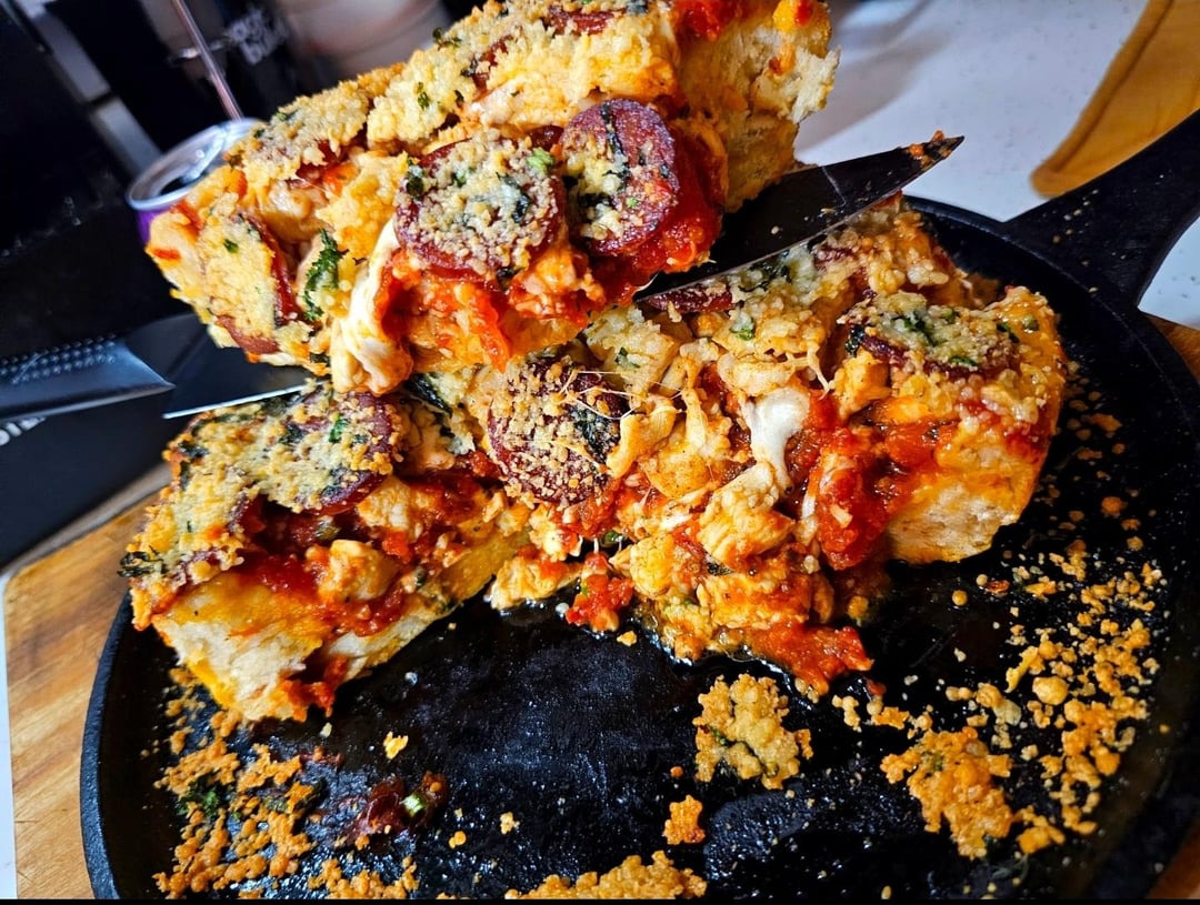 Brown some chicken in bacon fat, I used an otc rotisserie chicken seasoning, line the bottom of a pan with thick slices of pepperoni, put the chicken on top, layer of fresh mozzarella, and then a lot of your favorite sauce, I used my homemade bacon/garlic tomato sauce.