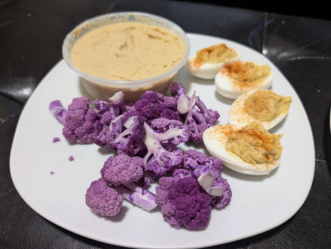 Found this lovely purple cauliflower at the market too. I paired with hummus from the Middle Eastern grocery because I think hummus and cauliflower are the best. Caesar salad-themed deviled eggs.