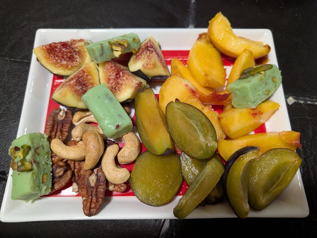 A cheeky snack plate. Local plums, peaches and a fig (not local) from the farmers market with some pecans and cashews from the Middle Eastern grocery. A few slices of pistachio milk fudge I got from a Mexican vender at a street festival.
