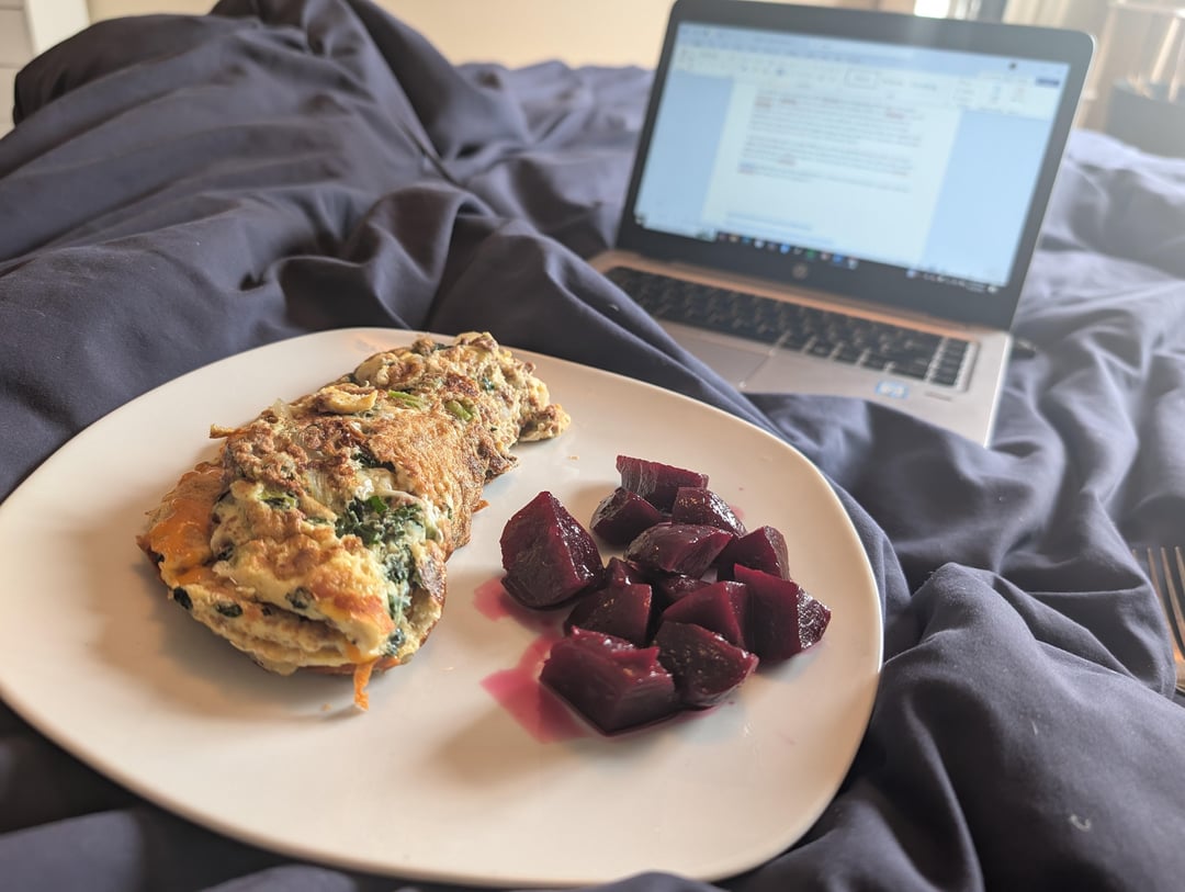 Omelette with kale, onions, chorizo tvp and cheddar. Side of pickled beets and my organic chemistry lab report.