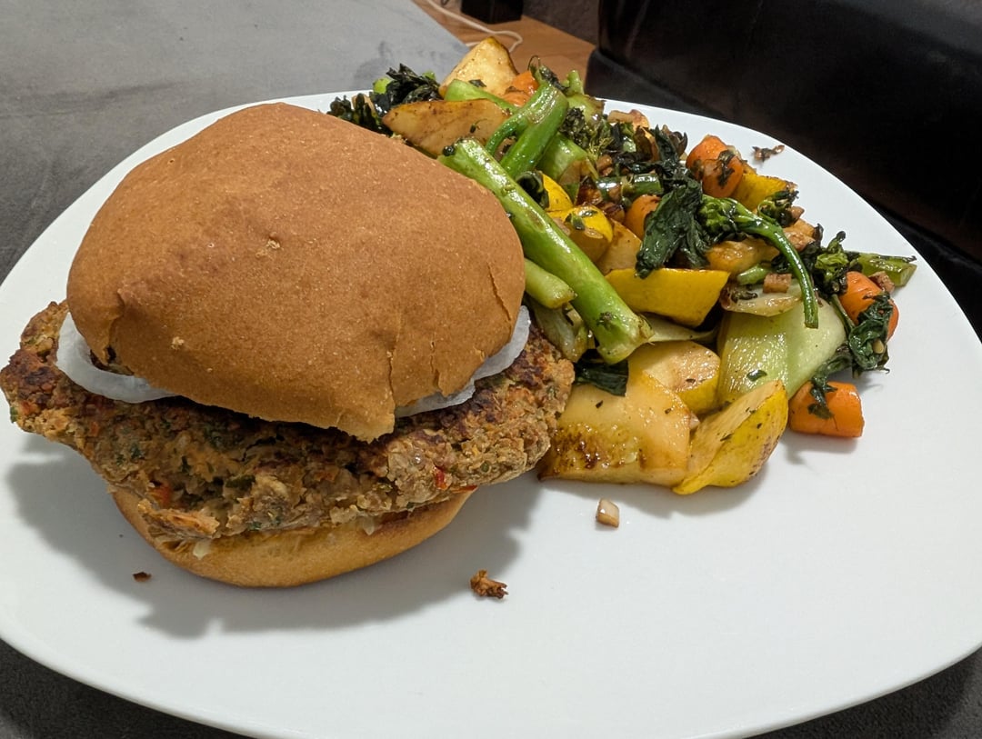 3) This is a veggie burger I whipped up before school and froze to make meal prep easier. They've got white beans, oats, egg white, tvp, nutritional yeast, walnuts, red pepper, kale, carrots, scallions, spices. Could have used a better bun but had to use up a gluten free bun from when I thought my wife might have celiac (she doesn't!). I think this is an appropriate amount of sauteed veggies on the side, all from the farmers market.