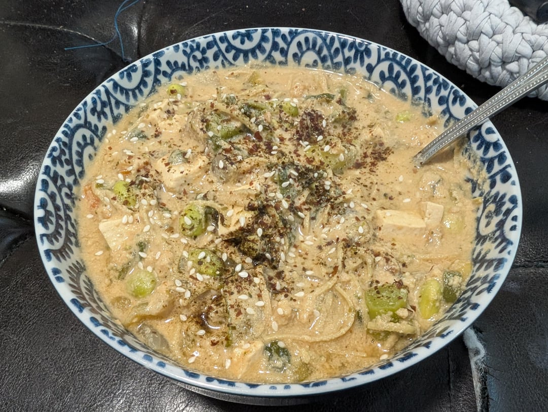 My spicy peanut miso egg drop super soy noodle soup lol (which I've posted before). But this time it turned out more stew-like because I cooked the noodles in the soup? I simmered some kombu and dried porcini mushrooms before adding my veggies, tofu, edamame, and tvp. Cooked my edamame noodles right in the soup. Added my paste (miso, tahini, sesame oil, soy sauce, sriracha, ginger, PB powder and some cooking water) off heat. Added liquid egg white to thicken. Garnished with sesame seeds and seaweed sprinkles. Forgot the scallions 🙁