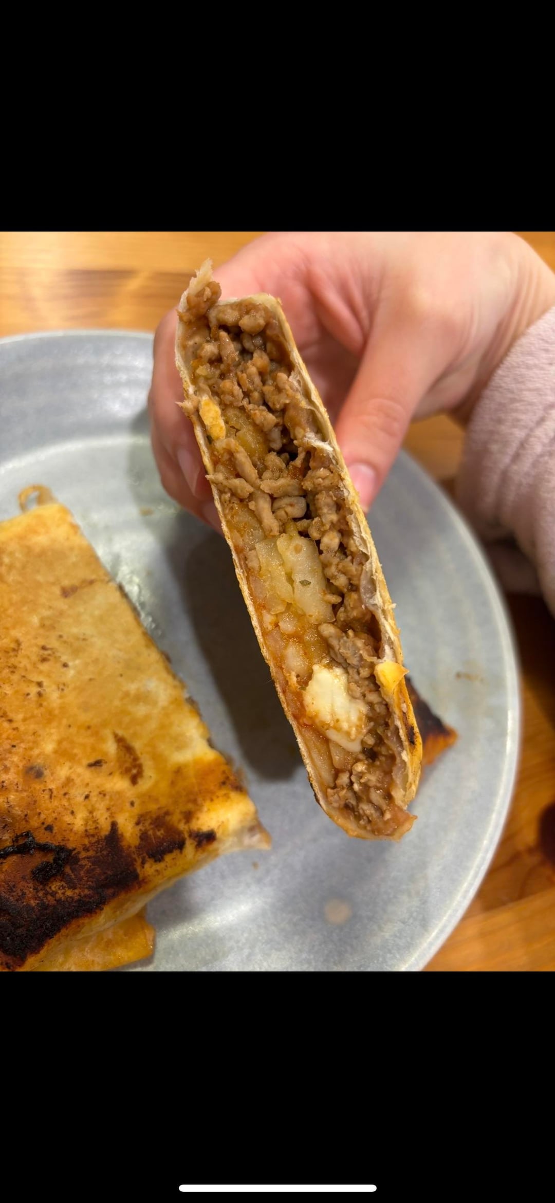 Photo 2: plain ground beef, tomato sauce, sour cream and hash brown in a toasted wrap