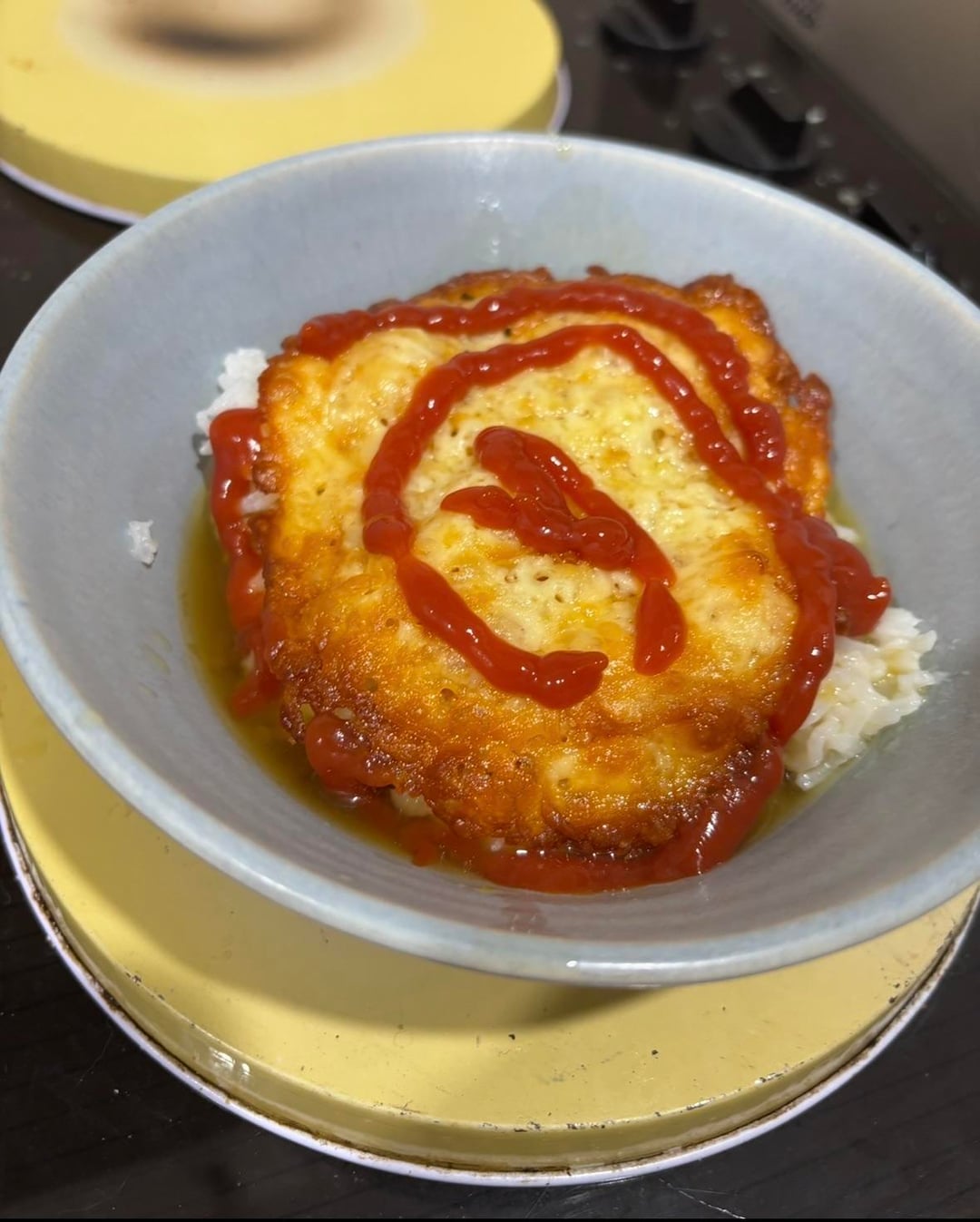 Photo 3: plain rice, sitting in miso soup with a pile of shredded cheese that I cooked in the oven until melted mass. Tomato sauce (this was a bad day, barely choked this one down. The cheese was NOT a good addition)
