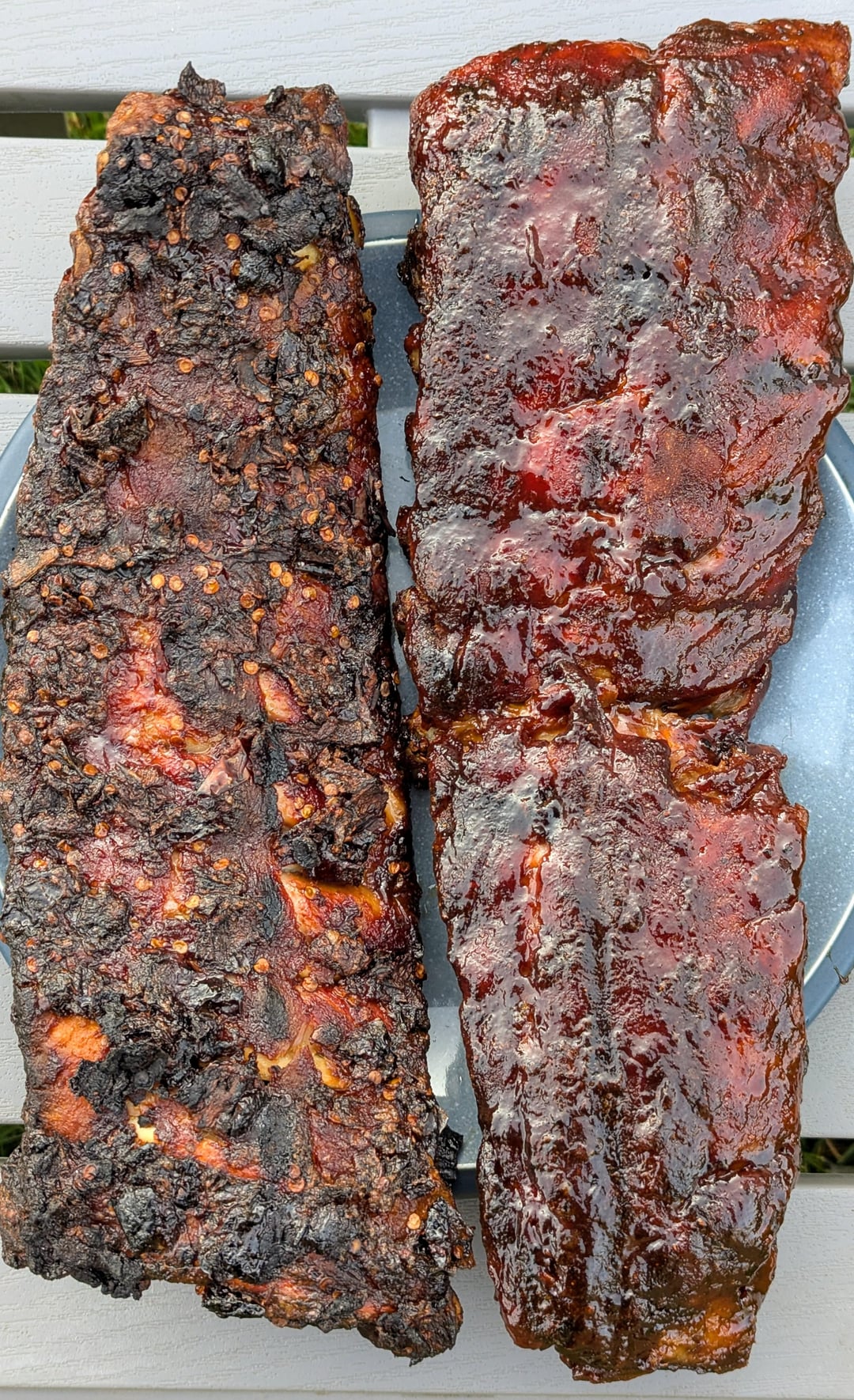 I trimmed, removed the membrane & sea salt tenderized both racks the night before. And I scratch make the demerara Mexican chipotle adobo rub / sauce, while the other is a premium BBQ competition award winning sauce. I also put the chipotle adobo rack over medium direct heat for 3-5 minutes a side at the end of the grill cook to denature the spicy heat. It comes out sweet, earthy and only a touch spicy.