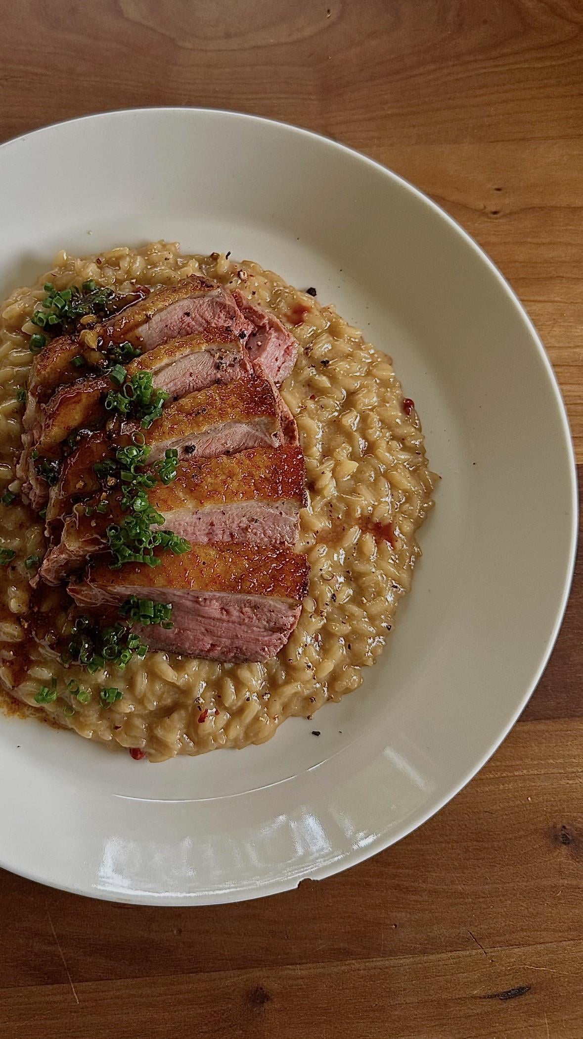 Duck Breast with Garlic Confit Risotto by bennetbjornk 11 Comments Jessies_Vibes 3 days ago Wow that looks absolutely delicious lynneplus3 3 days ago I’ve never had duck, but I would definitely try this dish! likeliqor 3 days ago Oh hell yes. How did you make the risotto? HeLikesSashimi 3 days ago Recipe please. I’d love to make these for my parents. My dad’s teeth are weak and I’m sure he’d love the breast. loulouce29 3 days ago Yes please! What time?? 😂 PunkR4wk3r 3 days ago https://preview.redd.it/fpsx7qf6qxrf1.jpeg?width=1080&format=pjpg&auto=webp&s=f389ccde901f4e750872803ed6b900e3bcb894a1 oneuglygeek 3 days ago Delicious Italia dish, honey ❤️😋 LoudSilence16 3 days ago This looks stunning. The dish itself looks delicious and the plating looks beautiful. Nice job Fuzzy_Welcome8348 3 days ago Looks beautiful!! Excellent job joe1up 3 days ago I would kill a man to eat this angsty_edge 3 days ago Give recipe now