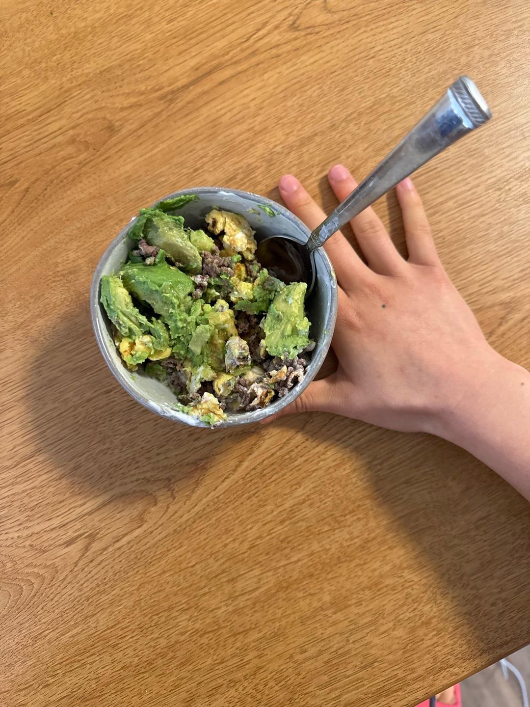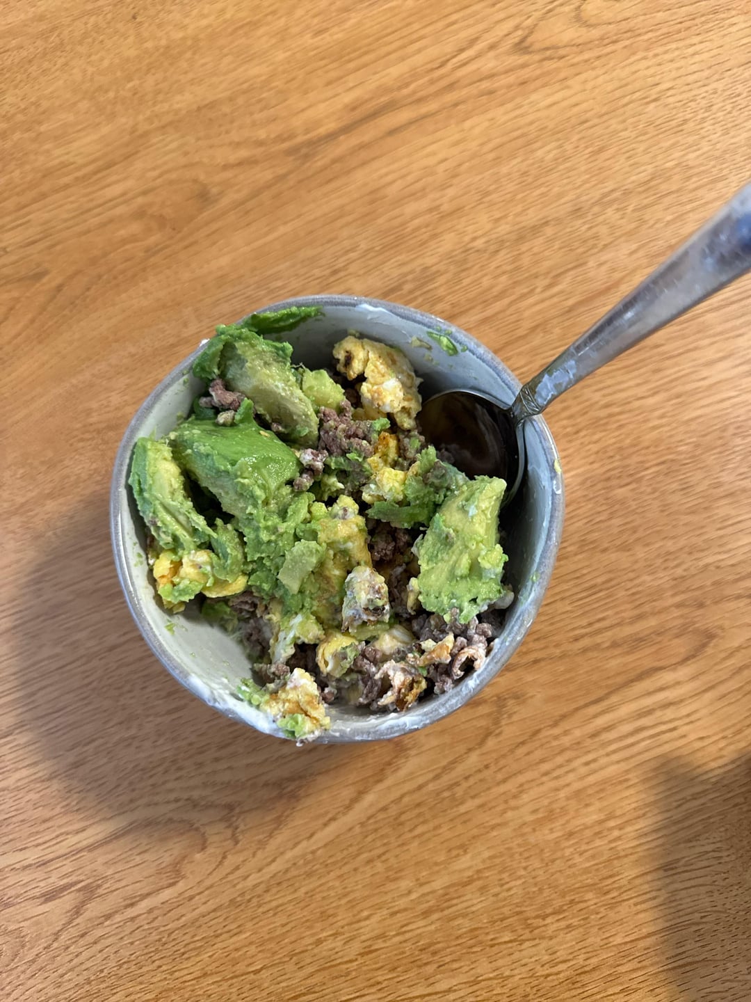Mostly ground beef, small avocado, a spoonful of plain Greek yogurt, one scrambled egg