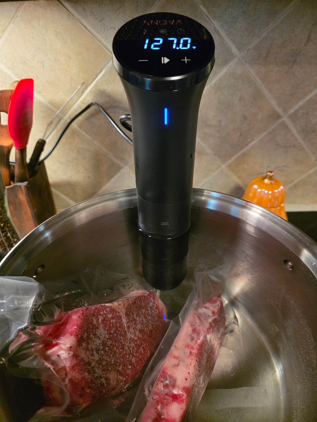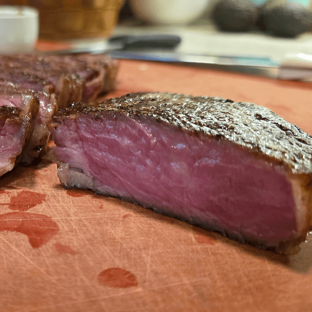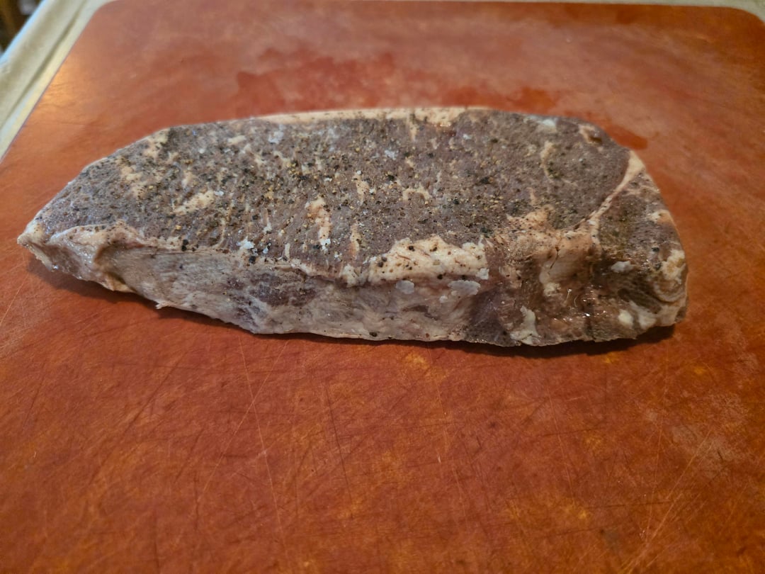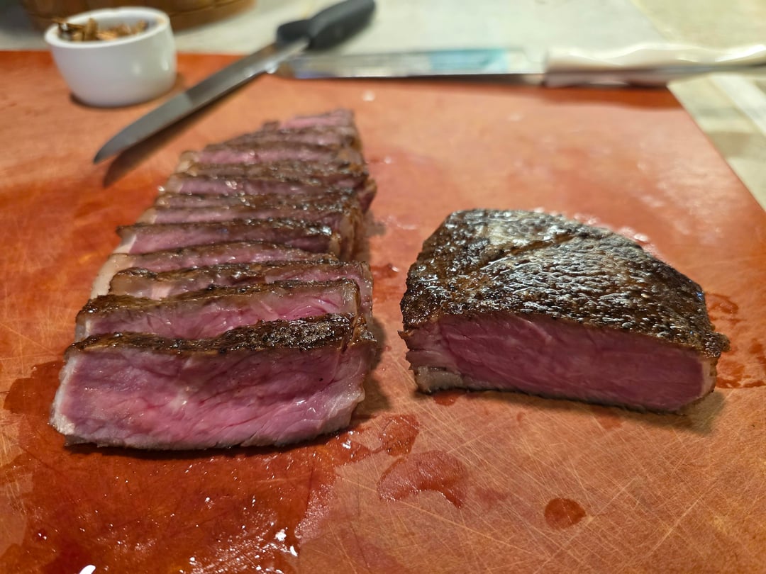 The final product pictured was the best of the two steaks. The first one went on to the stainless shortly after the bath. The one shown sat in the vacseal bag overnight, and came out so much better than the first. Seared in butter with garlic. Simply delicious!