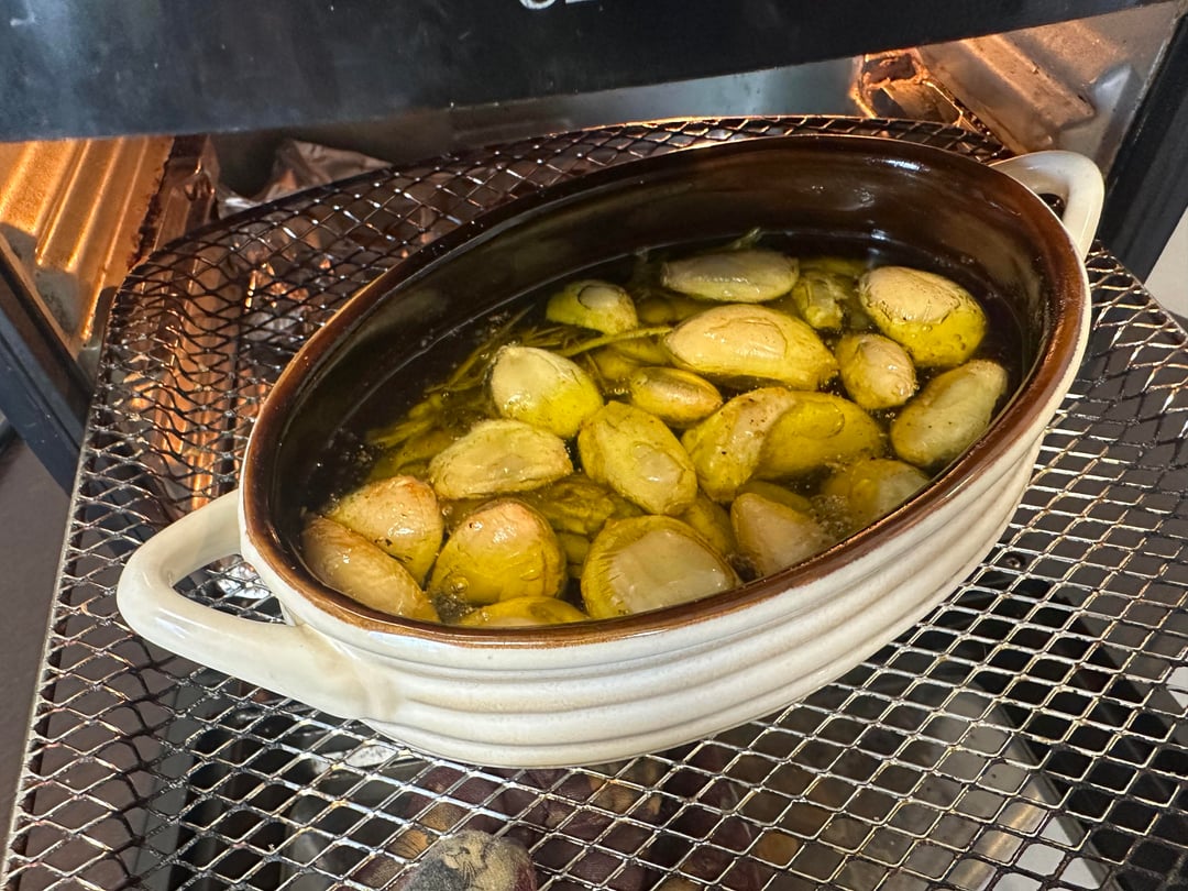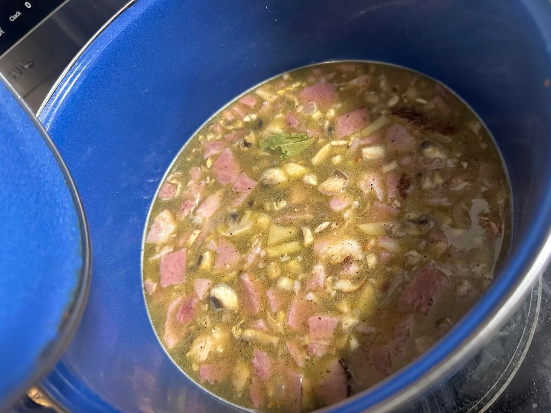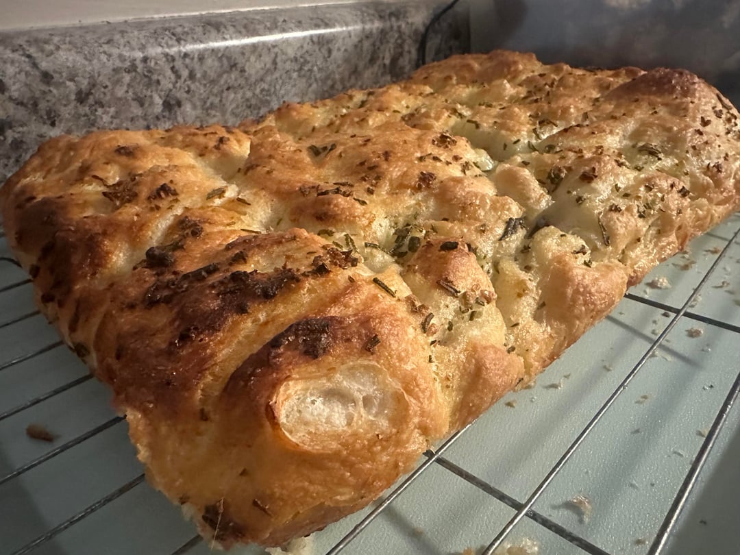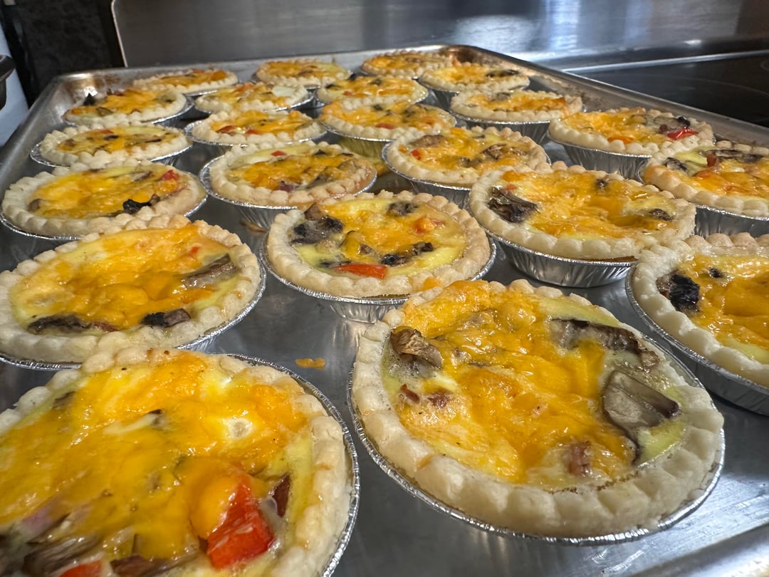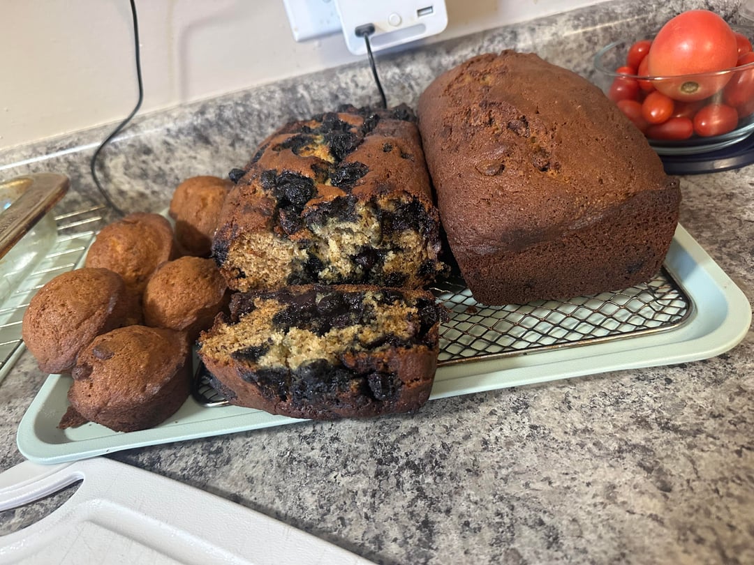 Ham and split pea soup (had frozen ham chunks and stock), 60 mini quiches, banana bread and muffins (chocolate chip in one, blueberry in the other), rosemary garlic confit, and a loaf of focaccia. Trying to use leftovers and stuff from my freezer and pantry the best that I can because groceries keep going up.