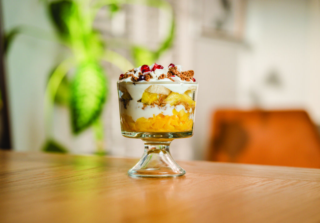 Mango and Pineapple Tropical Parfaits capture the flavors of ripe fruit, silky yogurt and crunchy granola in every spoonful of paradise while ruby-red pomegranate and coconut top off this island treasure.