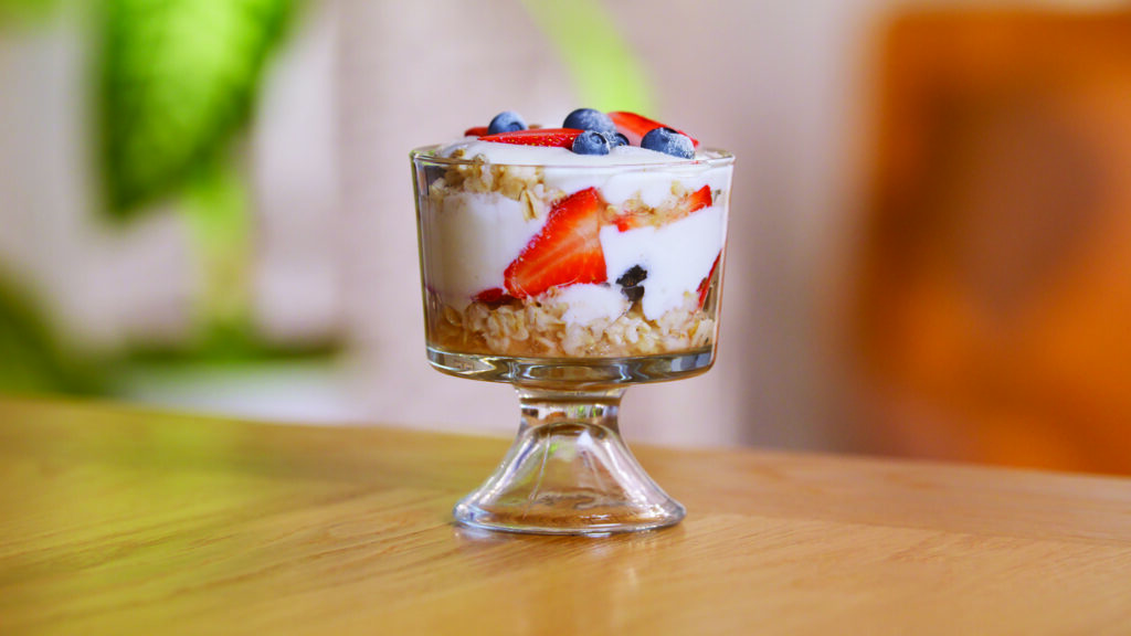 Fruity Oatmeal Yogurt Parfaits provide a protein-packed breakfast to start busy days while Frozen Yogurt Bark — a chilled delight with less than 100 calories per serving — helps you indulge without overdoing it.