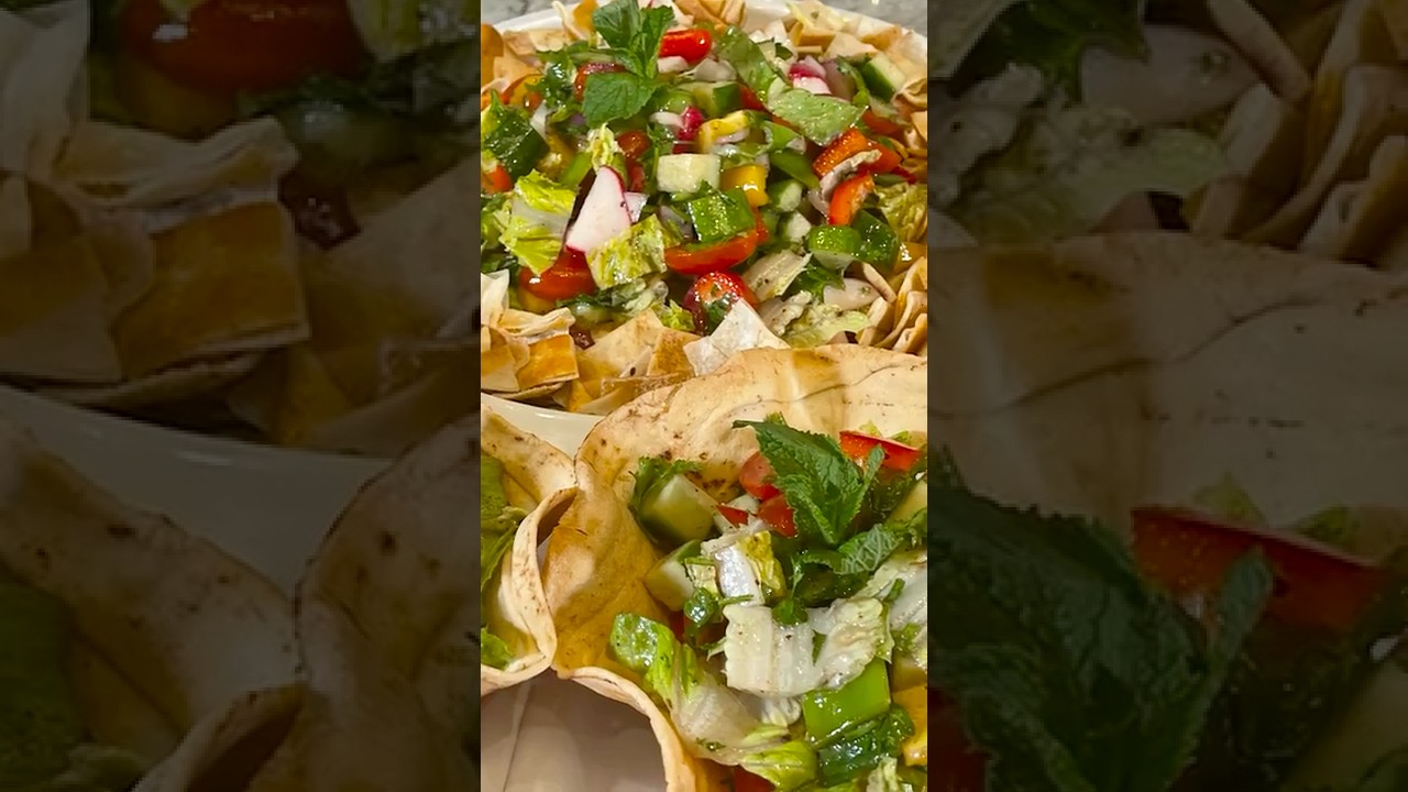 A recap for today’s episode. I made fatous salad. First of all, I prepared the toasted bread by cutting the pitha into squares. Drizzle with olive oil. Mix the coat. Arrange on baking pan line with parchment paper. Bake in 350 fah oven for 12 to 14 minutes. To make the toasted pa bread bowl, I brush both sides of pitha with olive oil and uh molded into pan baked in 350 fah oven for 14 to 16 minutes. Set aside to cool completely. In a large mixing bowl, I mixed all the vegetables. Romaine lettuce, tomatoes, cucumbers, uh red pepper, yellow pepper, green pepper, radishes, onion, bunch of parsley, and then the fresh mint. Mix well. And then I prepared the dressing by placing the olive oil, lemon juice, pomegranate, molasses, sumat, salt, and pepper in a jar. Shake well. Pour over salad and mix to coat. I served the fetous on a platter with toasted pita bread or I served it in a toasted pa bread bowl and it was ready for us to be served.