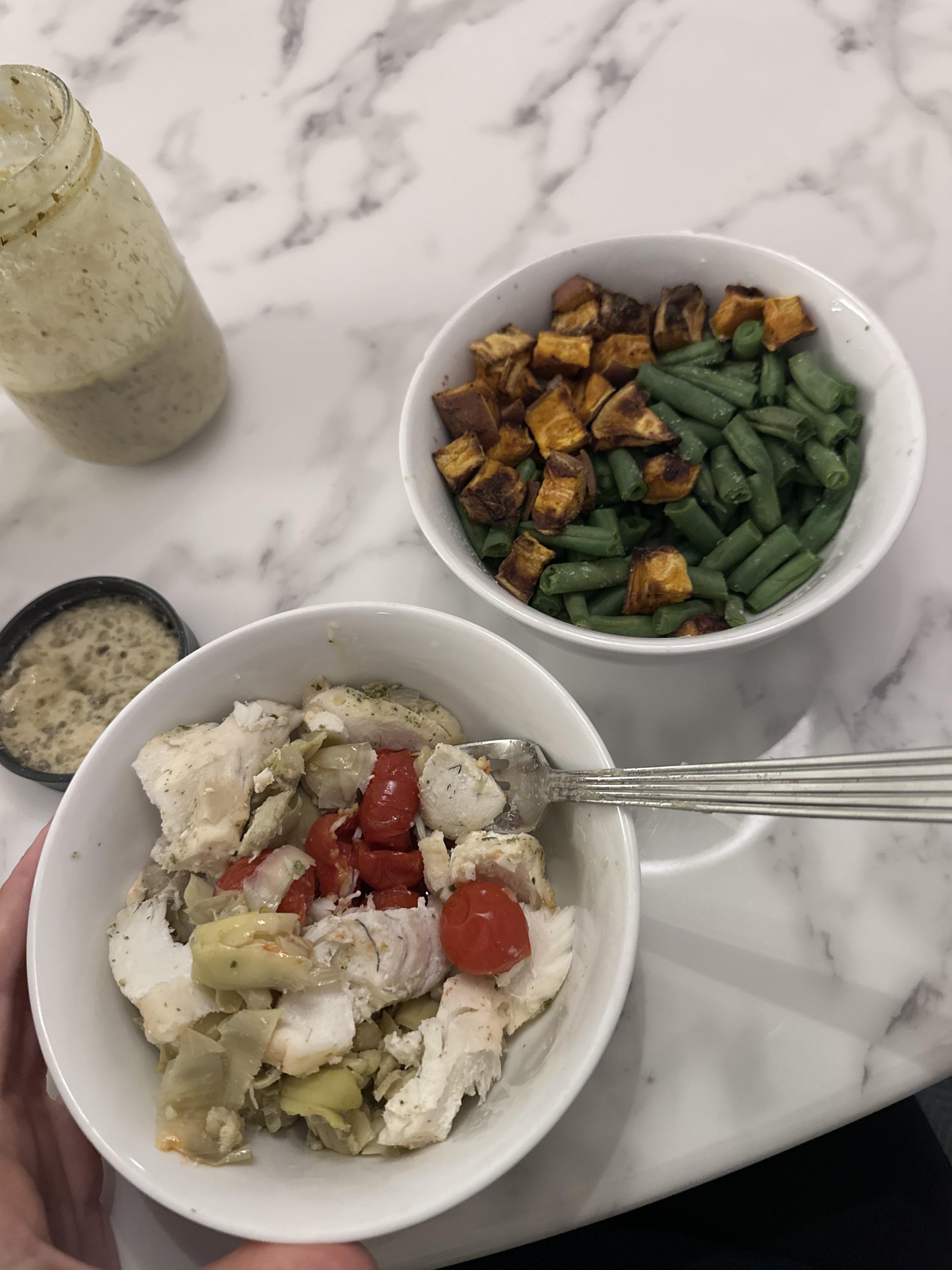 I did Cod, cherry tomatoes and artichokes. Roasted those all in a dish in oven @400°. Then a side of homemade vinegarette. My other veggies: green beans, sweet potato. I prefer sweet potato over rice by BigRecommendation709 Dining and Cooking