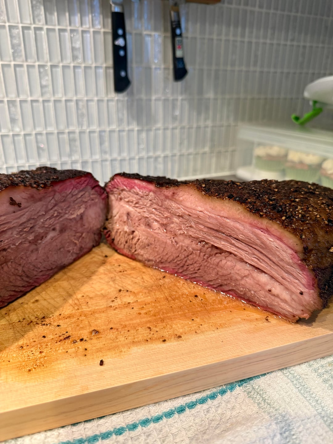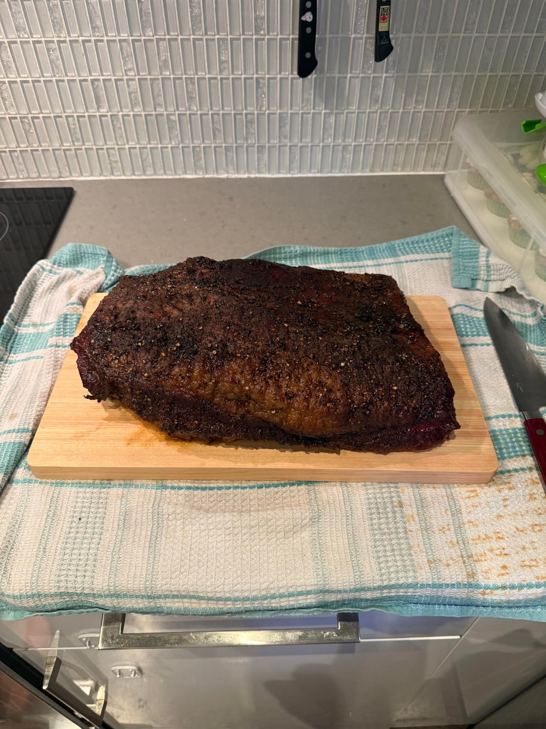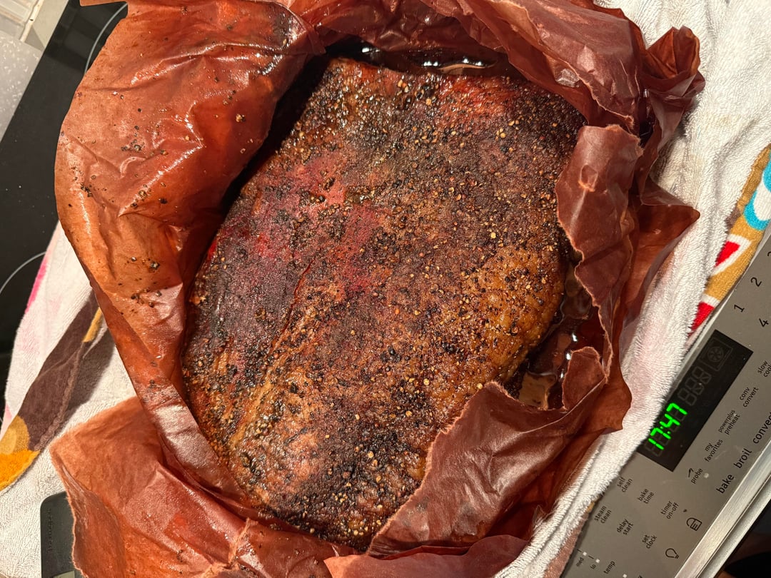 Rested 5 hours 1 hour to 170F on the table 4 hours in the cooler to about 143F.